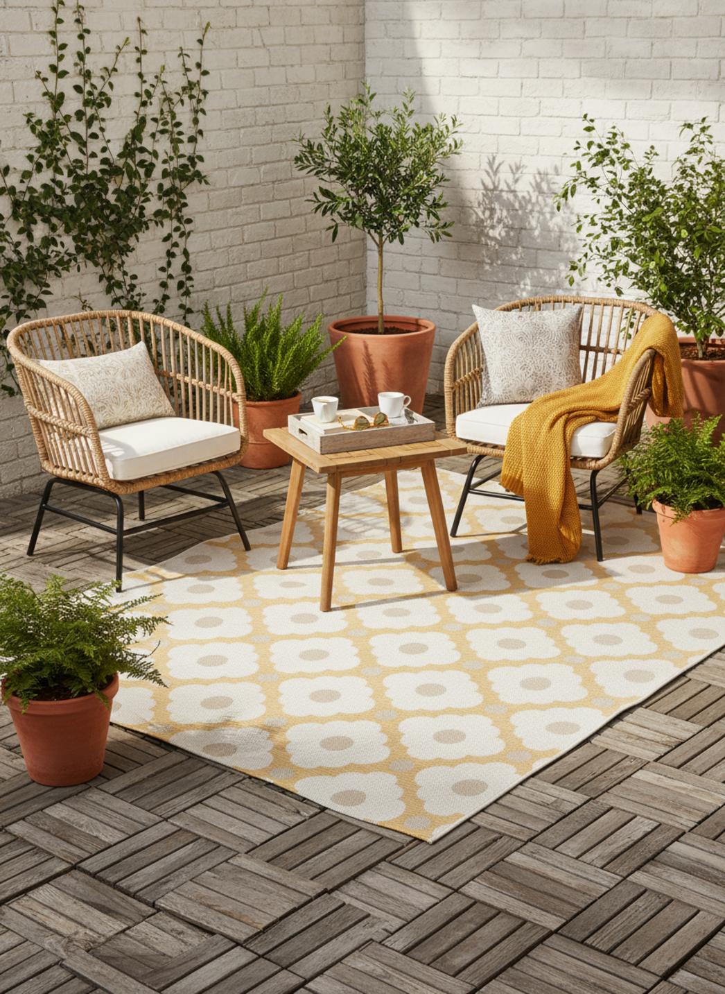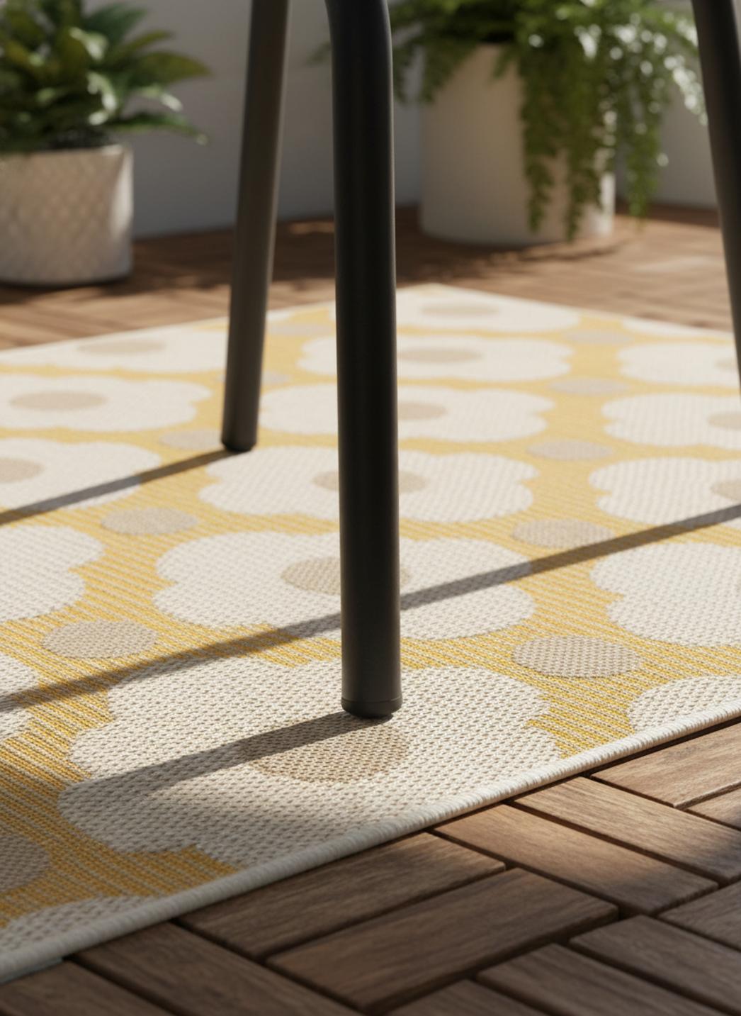 Délicat et plein de charme, ce tapis au style géométrique séduit par son motif à fleurs et l’harmonie douce de ses tons beige et jaune. Dans un format de 80x150 cm, il s’invite avec naturel sur une terrasse, un balcon ou un petit patio, où il apporte une touche lumineuse et raffinée. Son dessin allie rigueur géométrique et poésie florale, créant un équilibre subtil entre structure et légèreté. Le beige diffuse une chaleur apaisante tandis que le jaune apporte une note de fraîcheur solaire, parfaite pour égayer un espace extérieur. Ce tapis s’accorde merveilleusement avec les matières naturelles comme le bois, la pierre ou le rotin, rehaussant la décoration d’un éclat discret et harmonieux. Idéal pour un coin détente ou une entrée extérieure, il attire le regard sans jamais alourdir l’ensemble. Véritable alliance entre modernité et douceur naturelle, il transforme les extérieurs en lieux accueillants, lumineux et empreints d’élégance estivale.