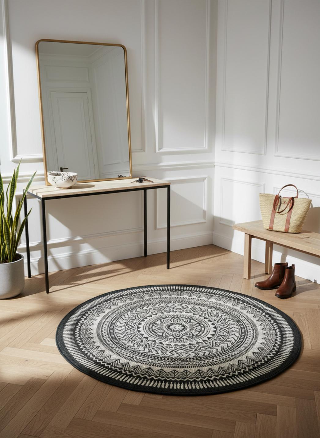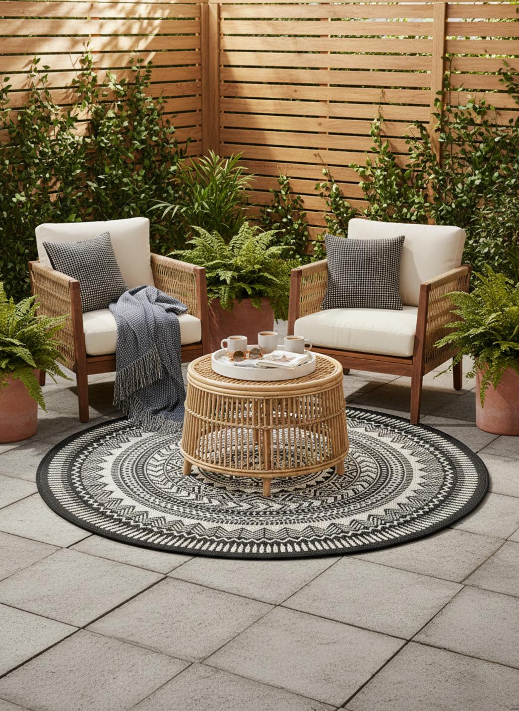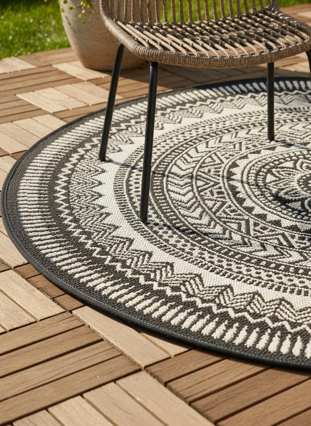 Épuré et contrasté, ce tapis au style géométrique inspiré du motif berbère séduit par la force graphique de son duo noir et blanc. Dans sa forme ronde de 120 cm de diamètre, il devient un point focal élégant sur une terrasse, un balcon ou un patio, où il structure l’espace avec équilibre et modernité. Ses motifs berbères stylisés évoquent l’artisanat traditionnel tout en adoptant une esthétique contemporaine, parfaite pour un décor extérieur au charme naturel et authentique. Le noir apporte profondeur et caractère, tandis que le blanc illumine l’ensemble, créant une harmonie visuelle forte et raffinée. Ce tapis s’accorde parfaitement avec les matériaux naturels comme le rotin, la pierre ou le bois, qu’il sublime par son contraste graphique. Idéal pour un coin détente ou un salon d’extérieur, il apporte une touche ethnique chic à la décoration. Véritable alliance entre tradition et design, il transforme les extérieurs en espaces harmonieux, expressifs et empreints de style.