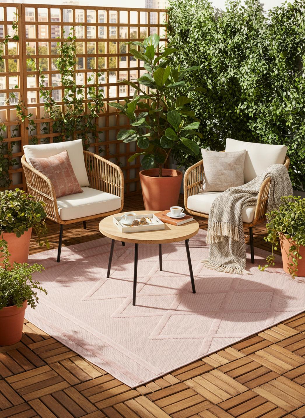 Chaleureux et plein de caractère, ce tapis au style géométrique séduit par son motif berbère revisité et la douceur lumineuse de sa teinte rose. Dans un format de 80x150 cm, il s’intègre parfaitement sur une terrasse, un balcon ou un petit patio, apportant une note bohème et contemporaine à la décoration extérieure. Inspiré des dessins traditionnels berbères, son motif géométrique évoque l’authenticité et le charme artisanal, tout en conservant une élégance moderne. Le rose, tendre et chaleureux, apporte une touche de délicatesse et s’accorde harmonieusement avec les matériaux naturels comme le bois, la pierre ou le rotin. Ce tapis illumine les espaces en y diffusant une atmosphère douce et conviviale, idéale pour un coin repas ou un espace détente. Véritable fusion entre tradition et modernité, il transforme les extérieurs en lieux accueillants et apaisants, où chaque détail respire la chaleur, la lumière et le raffinement.