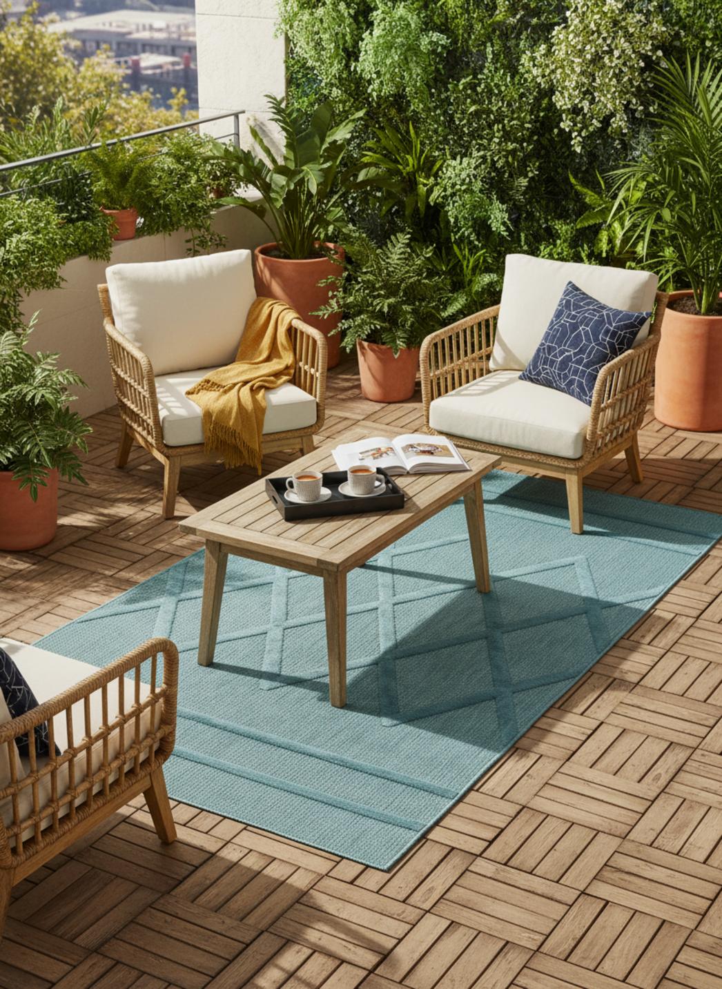 Frais et lumineux, ce tapis au style géométrique et au motif berbère se distingue par l’éclat apaisant de sa teinte turquoise. Dans un format de 80x150 cm, il habille à merveille une terrasse, un balcon ou un petit patio, apportant une note colorée et pleine de vie à la décoration extérieure. Inspiré des motifs berbères traditionnels, son dessin aux lignes franches et équilibrées crée un jeu visuel à la fois authentique et moderne. Le turquoise évoque la mer et le ciel d’été, diffusant une impression de fraîcheur et de liberté, idéale pour les espaces baignés de lumière. Ce tapis s’accorde naturellement avec les matériaux bruts comme le bois, la pierre ou le rotin, tout en dynamisant les ambiances neutres. Placé sous une petite table, au pied d’un fauteuil ou dans un coin détente, il structure l’espace tout en insufflant une atmosphère sereine et vivante. Véritable invitation à la détente, il transforme les extérieurs en havres colorés où tradition et modernité se rencontrent en parfaite harmonie.