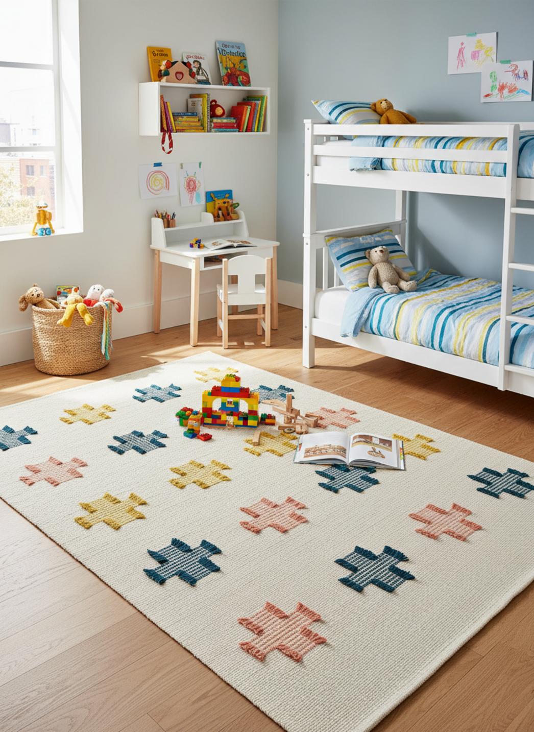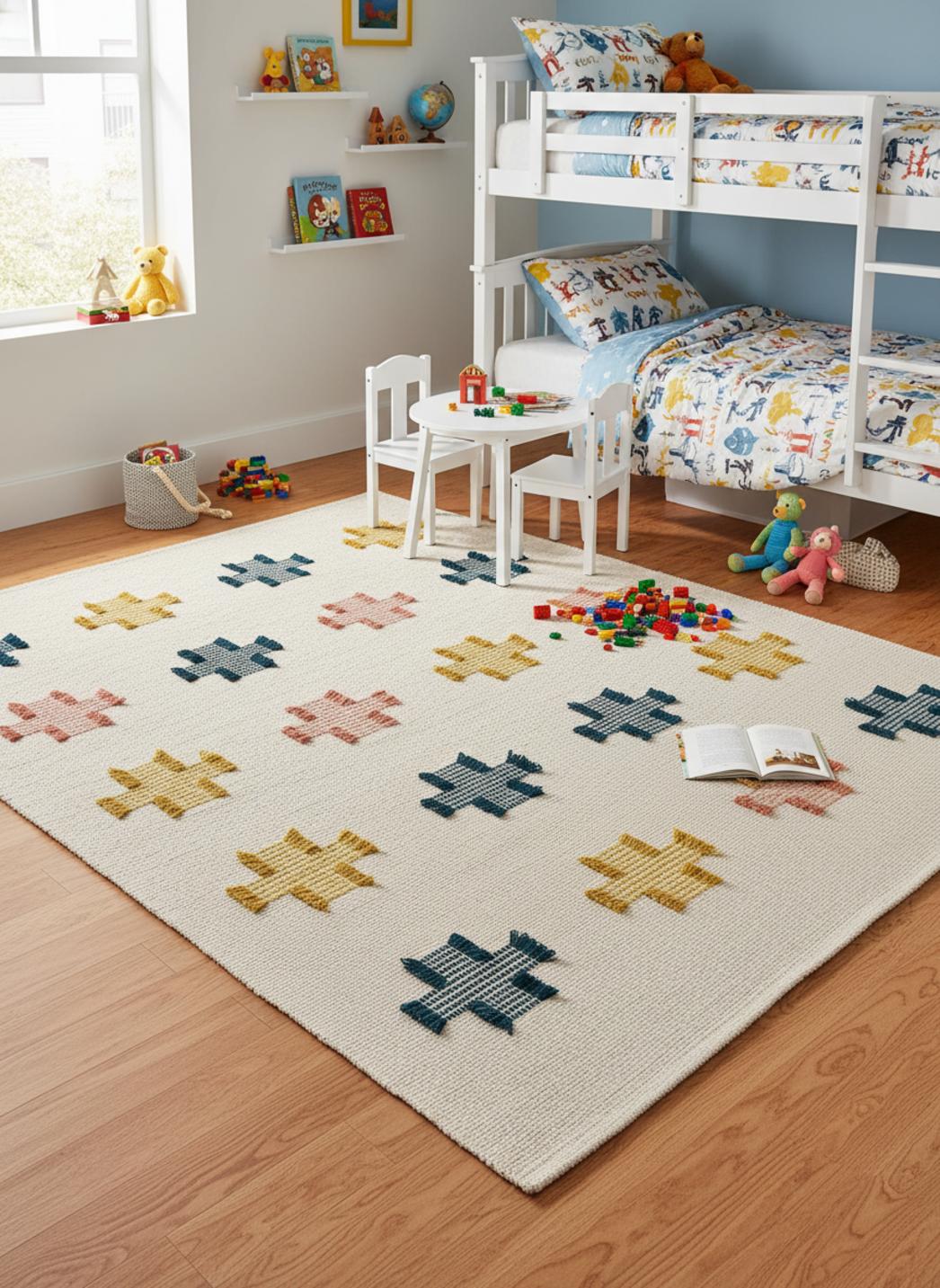 Autour des meubles bas et d'une lampe de chevet, la palette multicolore s'harmonise avec les textures naturelles et les tissus douillets de la chambre, créant une atmosphère lumineuse où chaque couleur stimule l'imagination sans jamais écraser la tranquillité du lieu. Le dessin en croix, graphique et rassurant, trace des repères visuels qui encouragent l'organisation des petits coins de partage et d'invention.