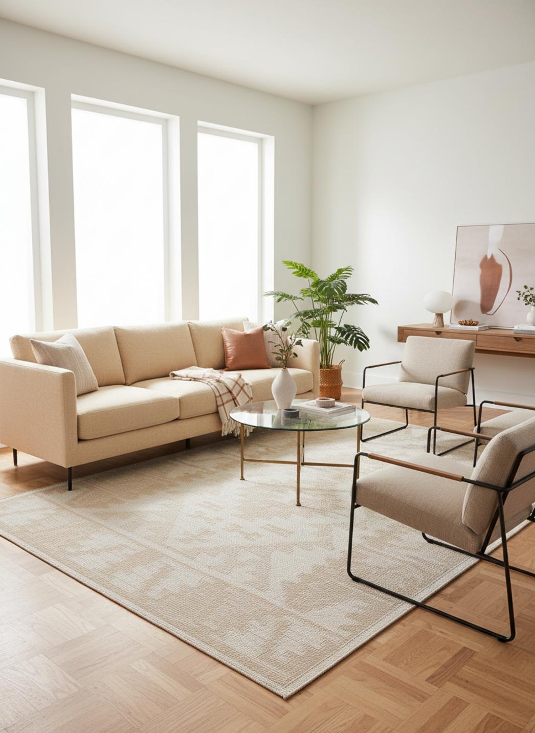 Une présence douce et contemporaine s'installe sous vos meubles avec ce tapis au dessin géométrique, où la palette beige diffuse une chaleur visuelle immédiate. La matière révèle des textures artisanales qui se lisent au toucher comme en regard, offrant une impression de surface travaillée et respirante. Sur cet écrin, le motif se déploie en rythmes calmes, laissant transparaître une sensibilité à la fois sobre et vibrante.
