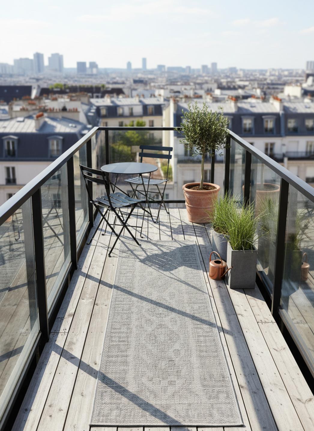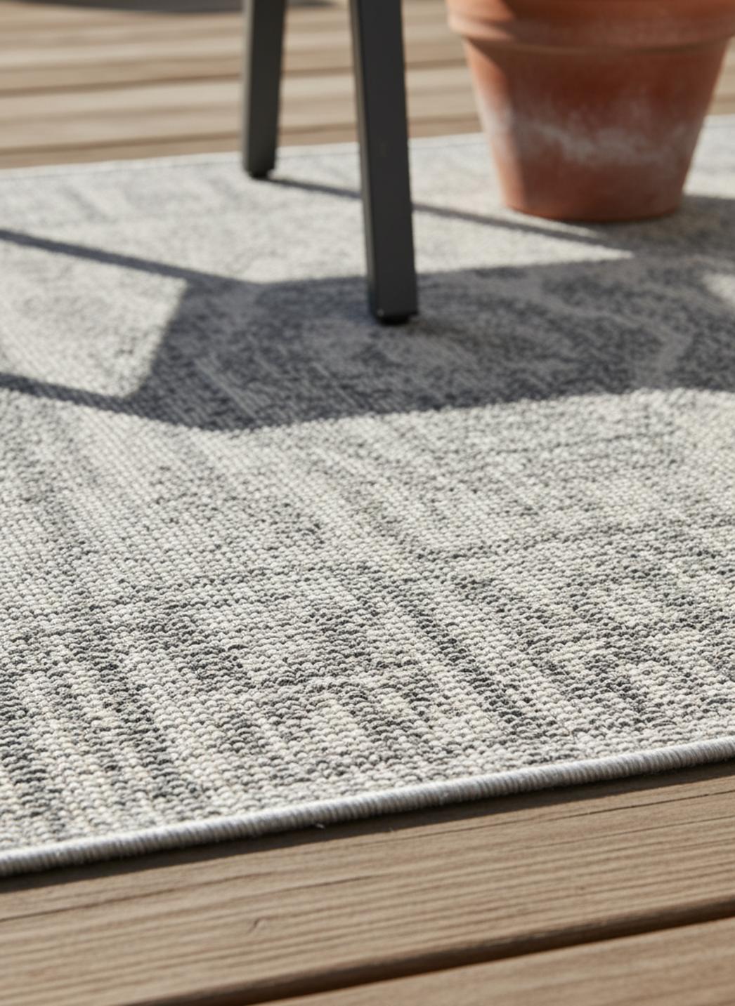 Pensé pour être posé tant en intérieur qu'en extérieur, ce tapis garde une allure raffinée, capable de résister aux usages quotidiens tout en conservant la sensation d'un objet fait-main. La finition met en valeur des textures palpables : sensation de tissage, relief léger et grain chaleureux. L'entretien se fait avec douceur, une aspiration régulière suffit pour préserver les fibres et assurer une bonne tenue dans le temps sans altérer la profondeur des teintes gris et l'éclat des motifs.
