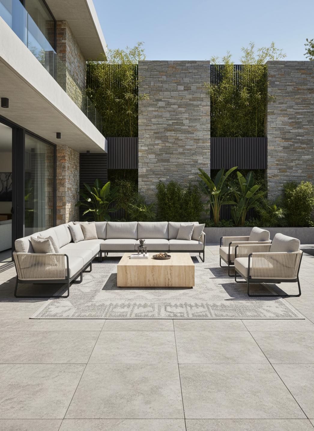 En alternant surfaces texturées et champs plus calmes, la pièce incarne la sensation de fait-main, même lorsqu'elle est produite pour un usage moderne. Les textures artisanales offrent une matière perceptible au pas, tandis que la construction garantit une bonne tenue dans le temps et une adaptation facile aux usages mixtes intérieur et extérieur, selon les besoins du décor.