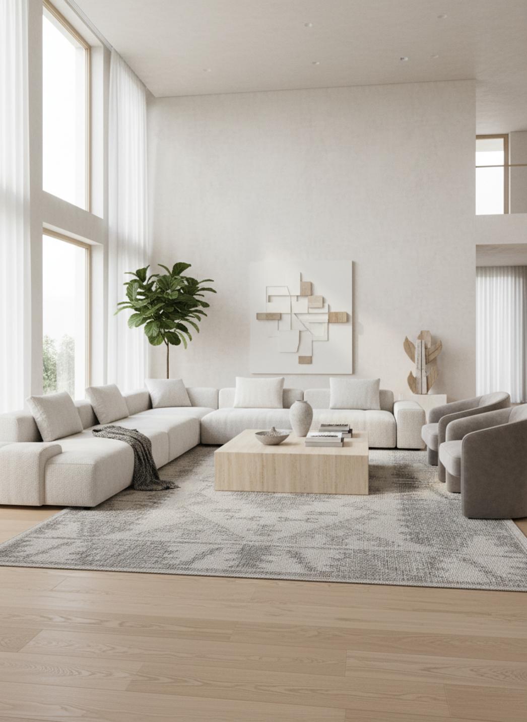 Sous une lumière tamisée, ce tapis déploie une aura chaleureuse où le gris devient une toile vivante pour un motif aux accents ethnique et profondément géométrique. Les nuances neutres invitent au toucher visuel, révélant des textures artisanales qui suggèrent la sensation du fait-main et une chaleur visuelle rassurante, parfaite pour créer une ambiance bohème moderne et raffinée.