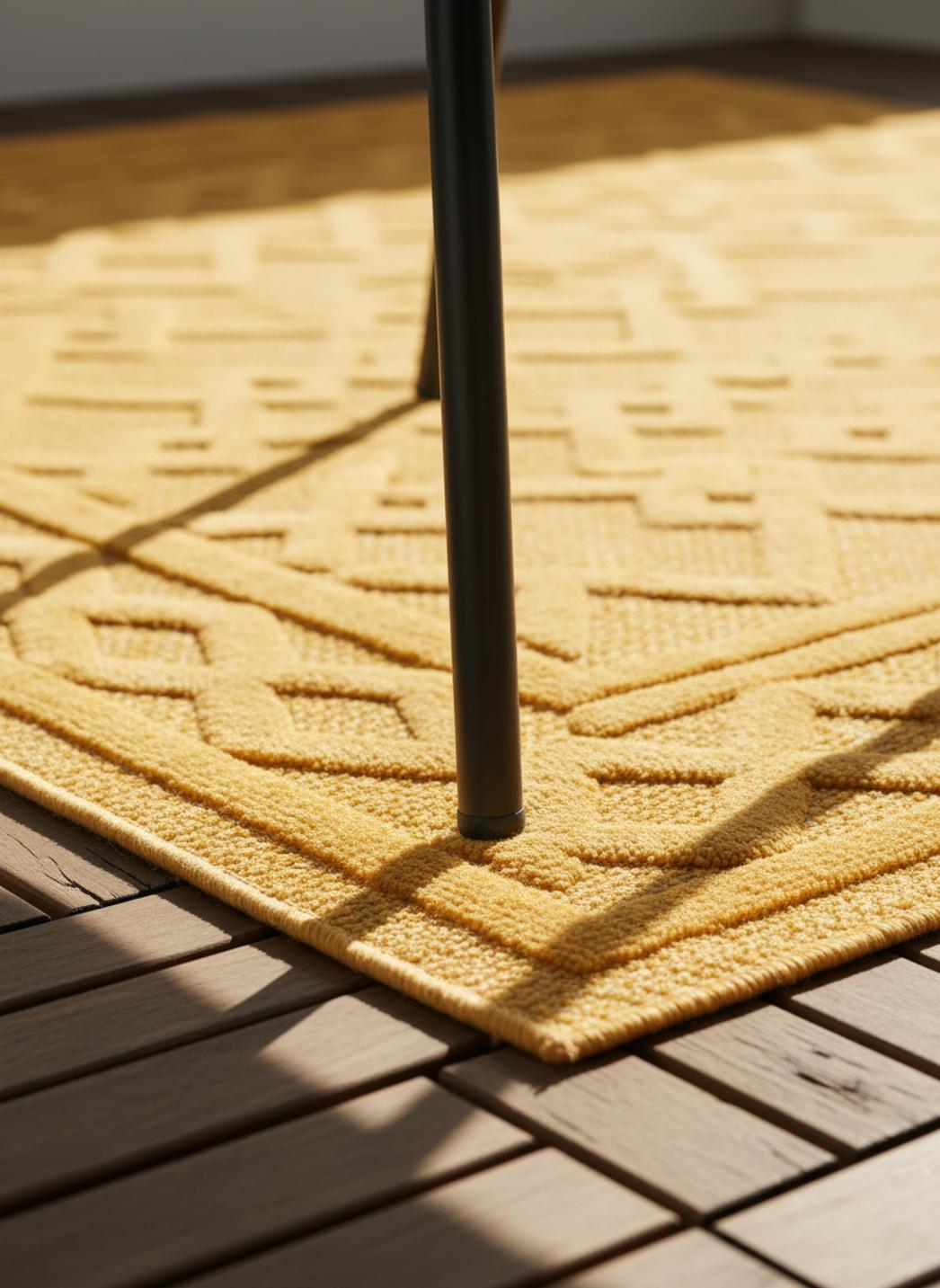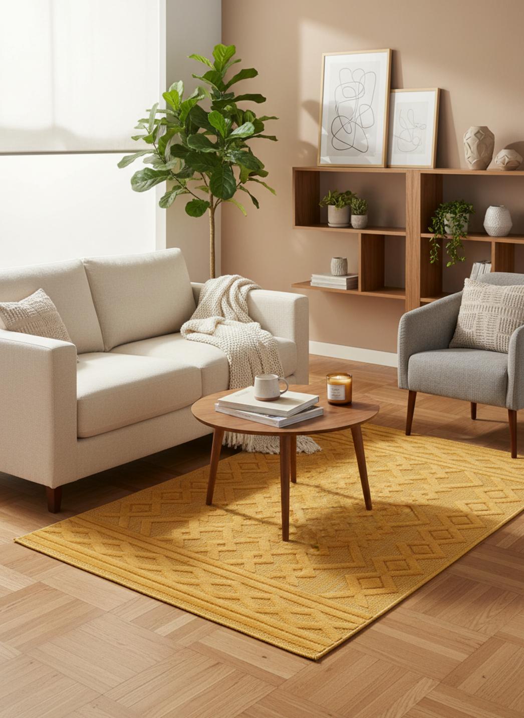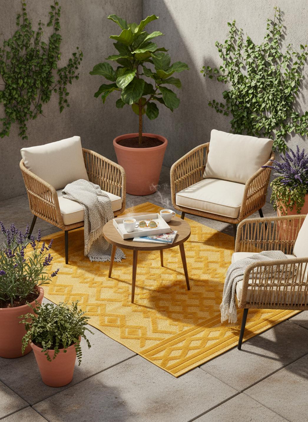 Audacieux et lumineux, ce tapis au style géométrique séduit par son motif ethnique en relief et la chaleur solaire de sa teinte jaune. Dans un format de 80x150 cm, il s’adapte parfaitement à une terrasse, un balcon ou un patio, où il insuffle une énergie vive et accueillante à la décoration extérieure. Son motif d’inspiration artisanale, rythmé par des formes géométriques subtiles, apporte texture et profondeur tout en évoquant le charme des tissages traditionnels. Le jaune, lumineux et éclatant, diffuse une atmosphère joyeuse et chaleureuse, idéale pour mettre en valeur les matériaux naturels comme le rotin, le bois ou la pierre. Ce tapis trouve naturellement sa place sous une petite table, dans un coin lecture ou détente, où il capte la lumière et anime l’espace avec douceur. Véritable accent décoratif, il transforme les extérieurs en lieux vibrants, harmonieux et baignés de soleil, alliant modernité, authenticité et vitalité estivale.