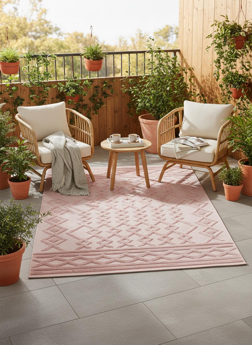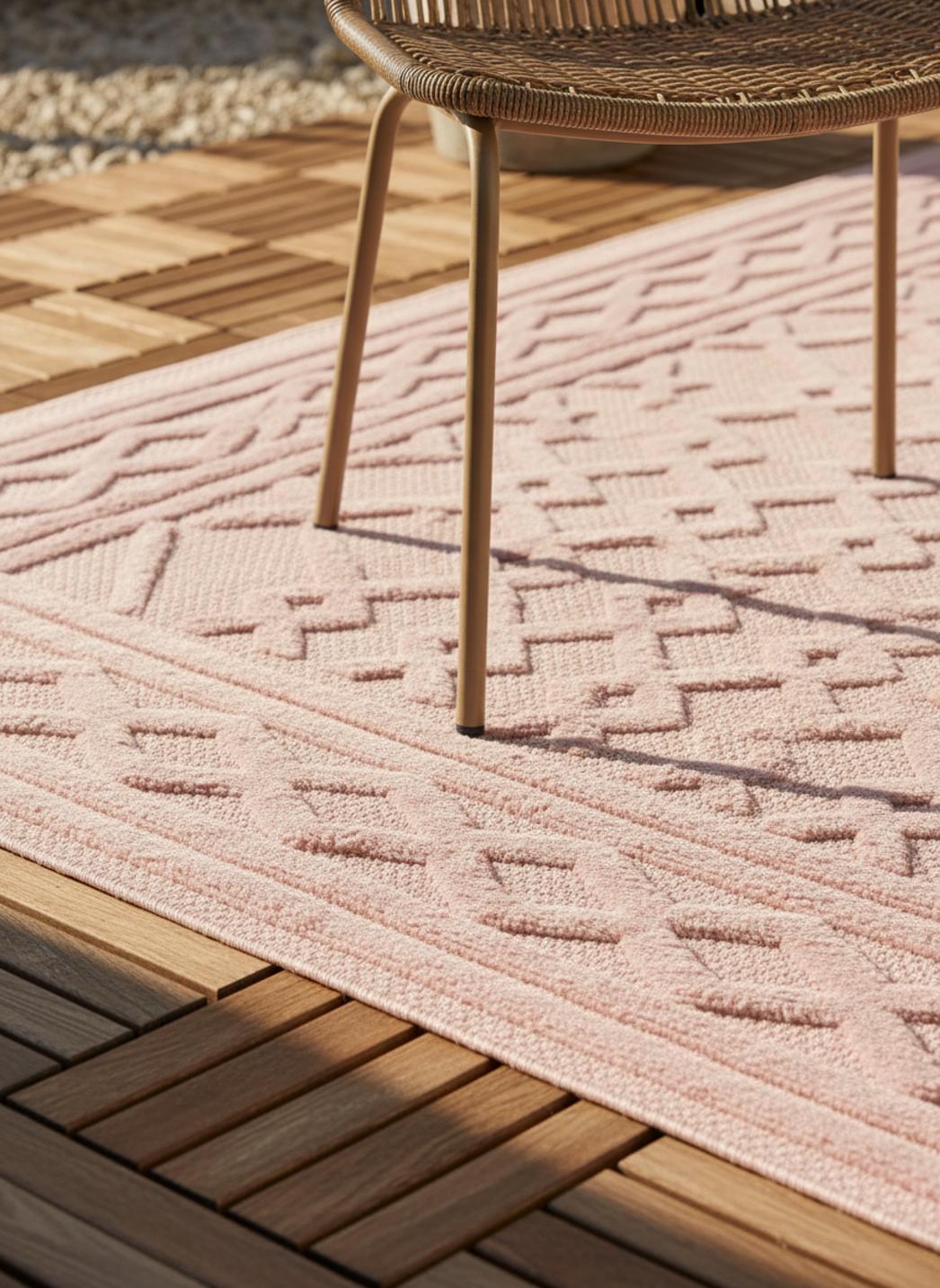 Chaleureux et raffiné, ce tapis au style géométrique séduit par son motif ethnique en relief et la douceur lumineuse de sa teinte rose. Dans un format de 80x150 cm, il s’intègre avec finesse sur une terrasse, un balcon ou un patio, où il apporte une note à la fois bohème et contemporaine. Son dessin inspiré des tissages artisanaux, rehaussé par un relief subtil, joue avec la lumière pour offrir une texture vivante et élégante. Le rose, tendre et apaisant, diffuse une atmosphère chaleureuse et harmonieuse, idéale pour adoucir un espace extérieur. Ce tapis se marie à merveille avec le rotin, le bois clair ou la pierre, créant une cohérence naturelle et pleine de charme. Parfait sous une petite table ou dans un coin détente, il apporte équilibre et confort visuel. Véritable touche de douceur, il transforme les extérieurs en lieux sereins, lumineux et empreints d’un charme délicatement poétique.