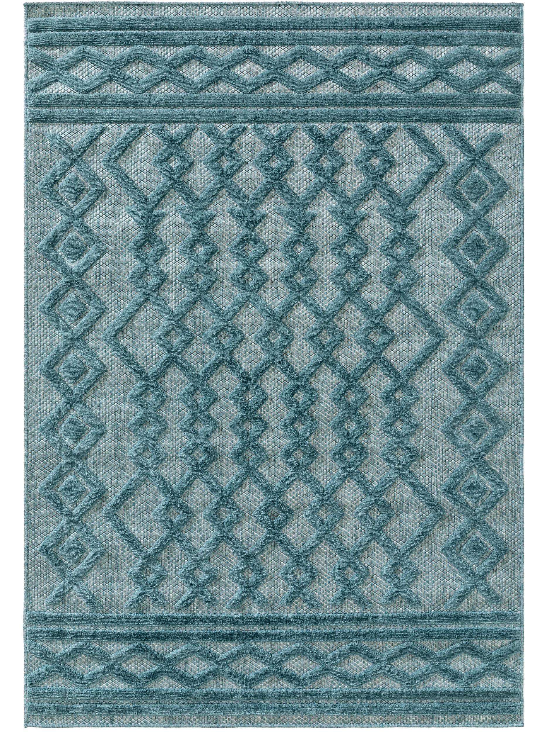 Tapis géométrique motif ethnique relief turquoise d'intérieur et d'extérieur 120x170 cm