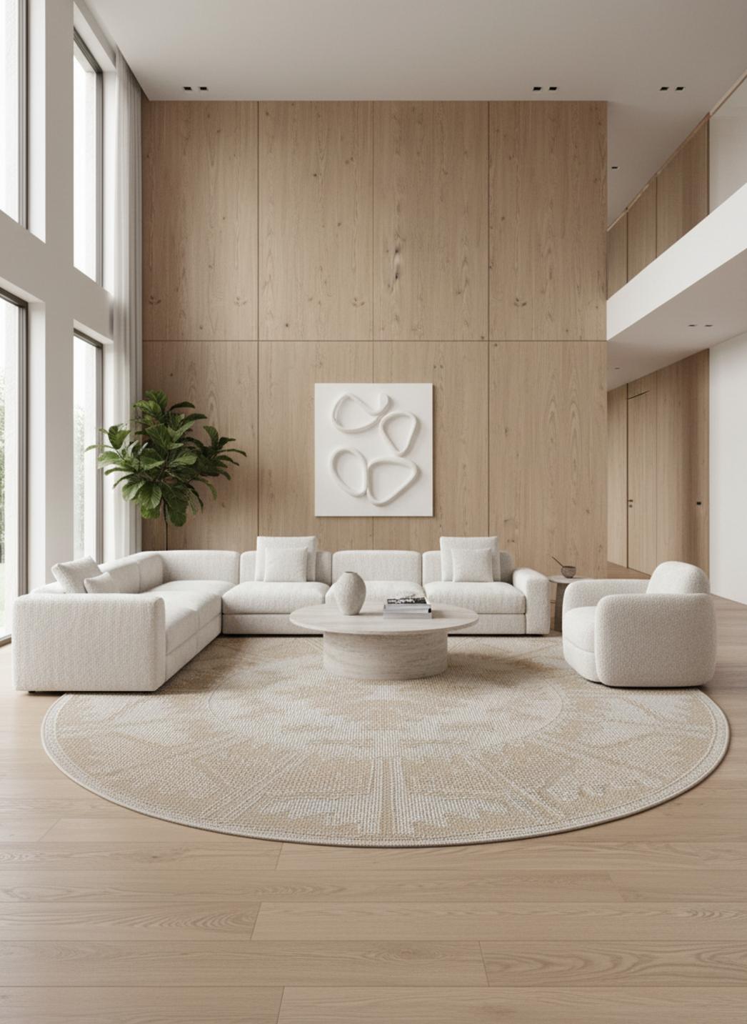 La forme rond du tapis offre une douceur visuelle immédiate, transformant le piétinement en caresse et le centre de la pièce en un point focal chaleureux. Adapté aux conversations et aux coins de lecture, ce format invite à la convivialité et structure délicatement l'aménagement autour du mobilier, tout en guidant le regard vers le centre avec une grande harmonie.