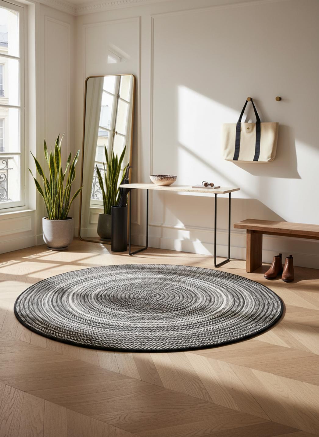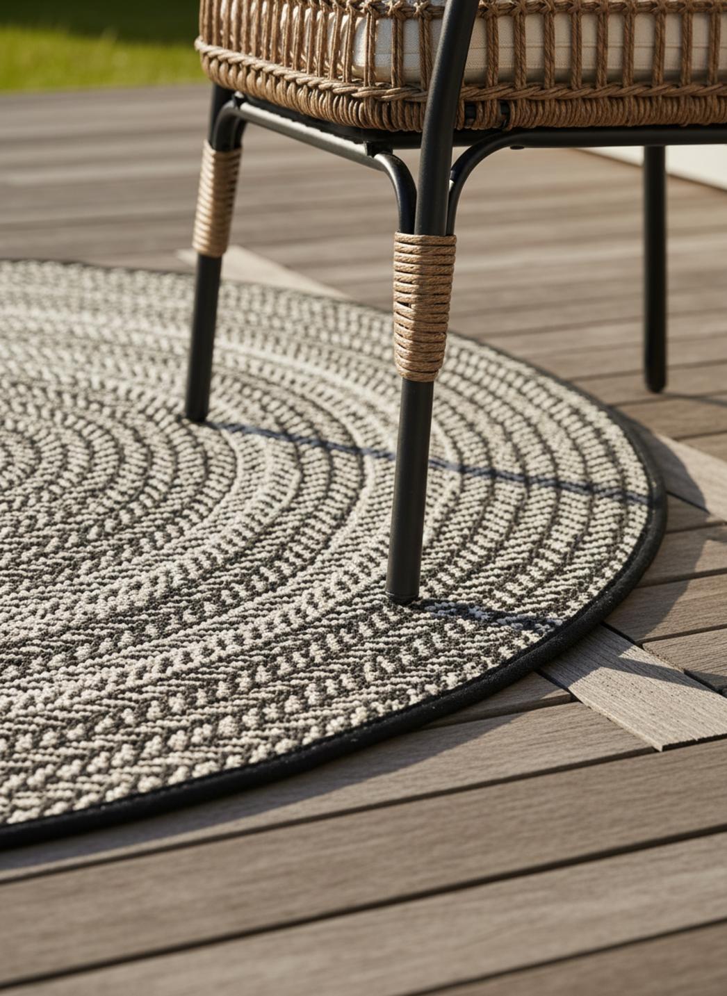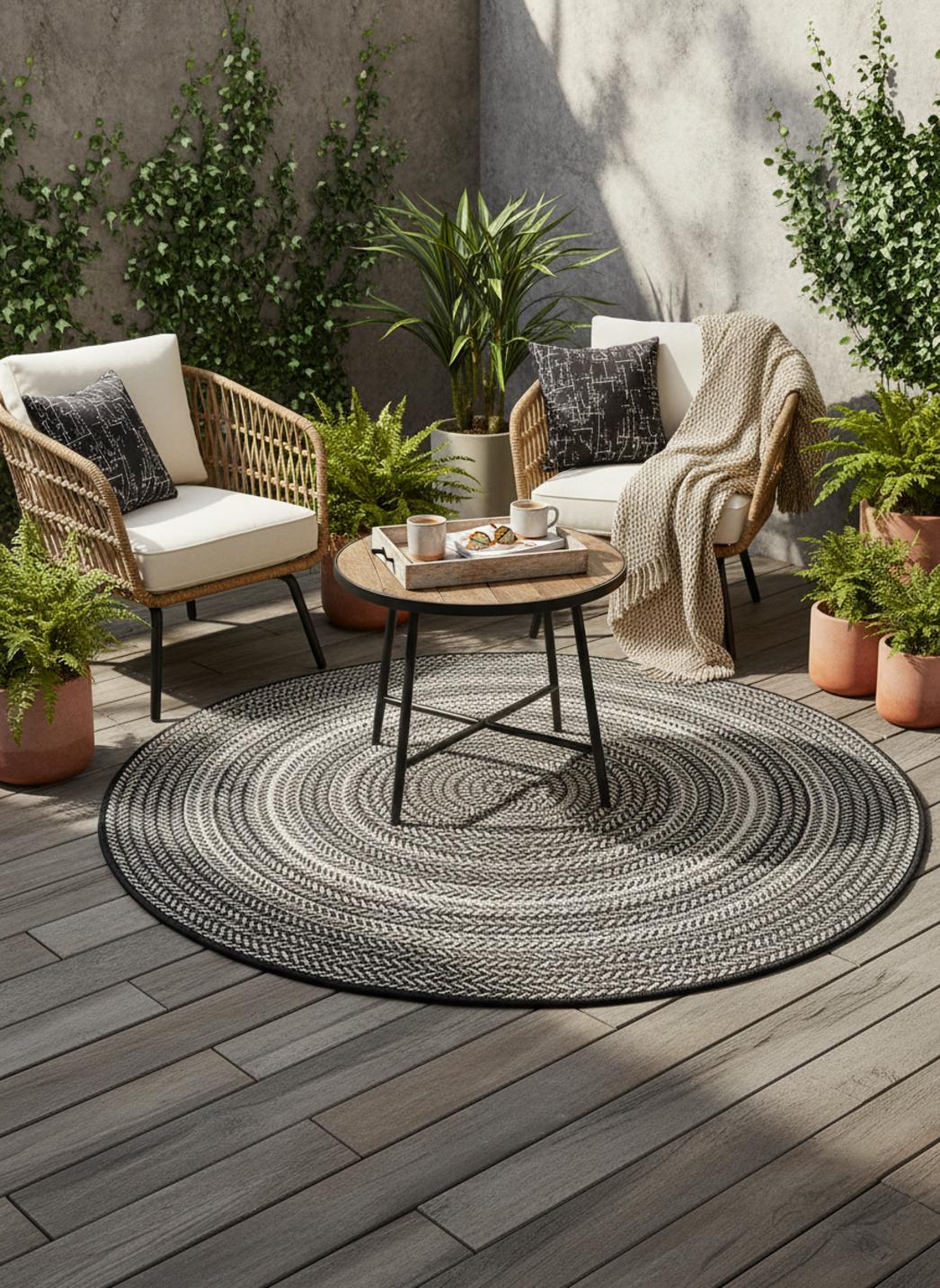Graphique et raffiné, ce tapis au style géométrique séduit par son motif ethnique et le contraste intemporel de ses tons noir et blanc. De forme ronde avec un diamètre de 120 cm, il s’intègre parfaitement sur une terrasse, un balcon ou un patio, où il devient un point central élégant et structurant. Son motif d’inspiration artisanale, rythmé et équilibré, évoque les symboles tribaux revisités dans une version moderne et harmonieuse. Le duo noir et blanc, à la fois sobre et expressif, crée un effet visuel saisissant tout en préservant une atmosphère apaisante. La forme ronde adoucit les lignes de l’espace, invitant à la convivialité et à la détente. Ce tapis s’accorde idéalement avec le bois, la pierre ou le rotin, apportant un équilibre parfait entre authenticité et modernité. Véritable accent décoratif, il illumine les extérieurs d’une élégance naturelle et contemporaine, transformant chaque espace en un lieu chaleureux et plein de caractère.