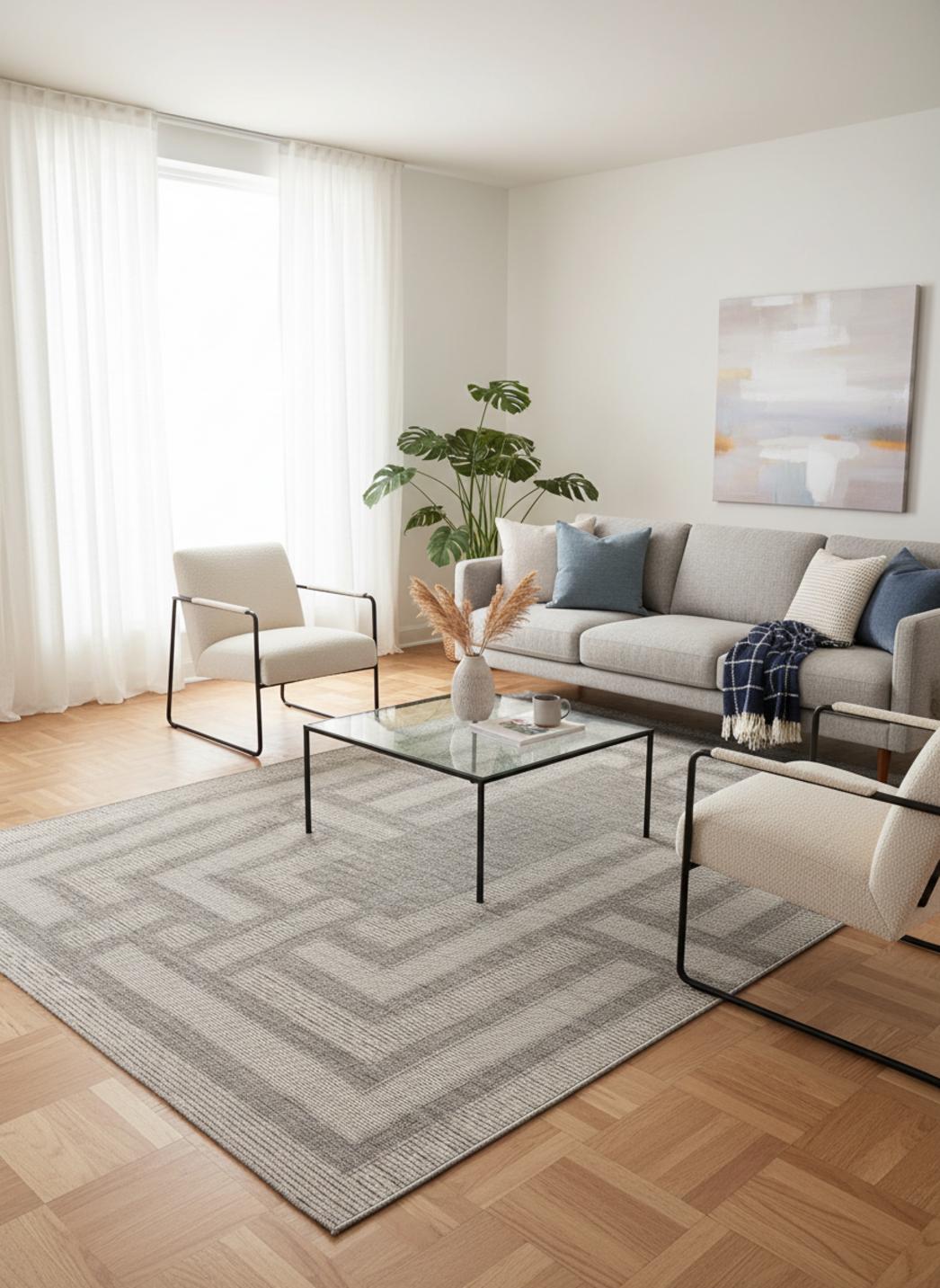 Dans une ambiance scandinave ou contemporaine, l’empreinte géométrique se prête autant à une pièce lumineuse qu’à un coin plus tamisé : le contraste modéré des lignes transforme la lumière en plans successifs et confère à la pièce une sensation de calme orchestré.