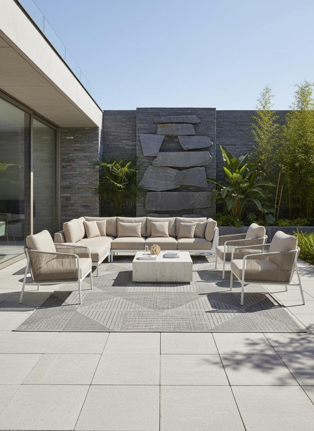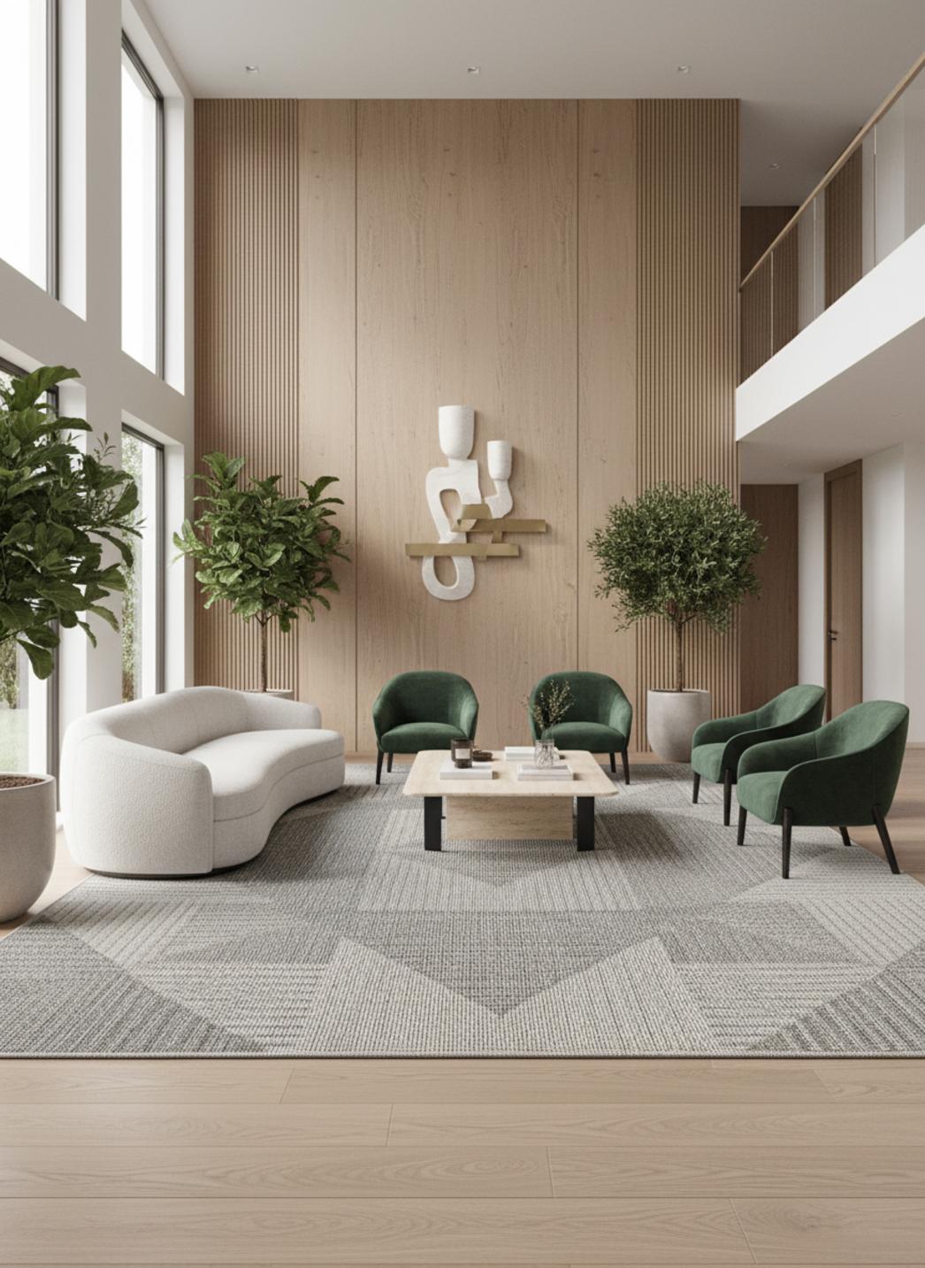 Dans un salon, cette pièce de grand format se comporte comme un cadre : la dimension de 300x400 cm définit une zone de conversation, souligne un canapé et crée un foyer visuel. En entrée ou sur une terrasse, sa généreuse empreinte impose un axe et accompagne naturellement le déplacement. Pensé pour l'usage en intérieur comme en extérieur, il transforme la circulation en expérience plus soigneuse.