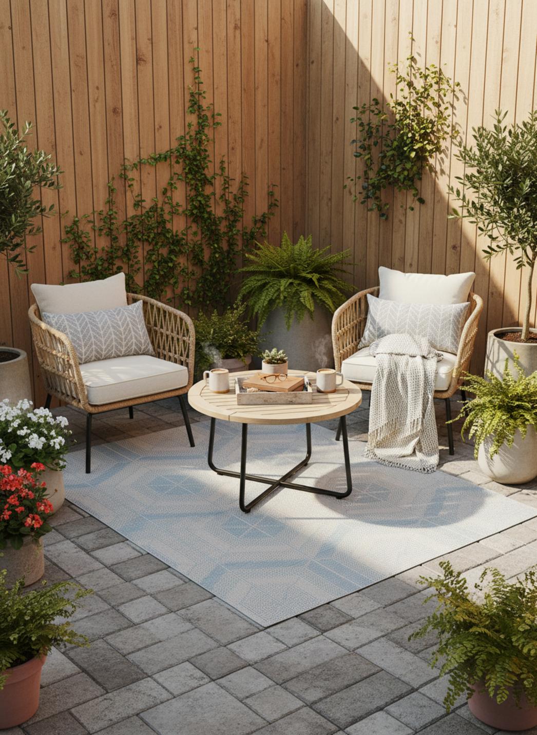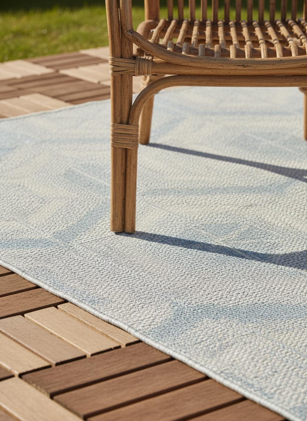 Sur un balcon ou au bord d’une terrasse, ce tapis géométrique au motif nid d’abeille bleu et beige attire le regard par la justesse de son équilibre visuel. Les alvéoles régulières forment une trame apaisante qui joue avec la lumière et crée un léger effet de relief, tout en apportant rythme et structure à l’espace. Le bleu, profond et frais, dialogue avec le beige naturel dans une harmonie qui évoque à la fois le ciel et le sable, la mer et la terre. Cette combinaison de teintes, douce mais vivante, s’accorde parfaitement avec les extérieurs modernes ou bohèmes, où elle diffuse une atmosphère à la fois claire et sereine. Son format 80x150 cm se prête aux zones plus intimes : le long d’une baie vitrée, sous une table d’appoint ou dans un coin détente extérieur. Le motif nid d’abeille, à la fois graphique et organique, capte le regard sans le contraindre, instaurant une sensation de fluidité et de confort visuel. Ce tapis bleu et beige transforme les petits espaces extérieurs en lieux d’équilibre et de douceur, où les formes géométriques se font poésie du quotidien.