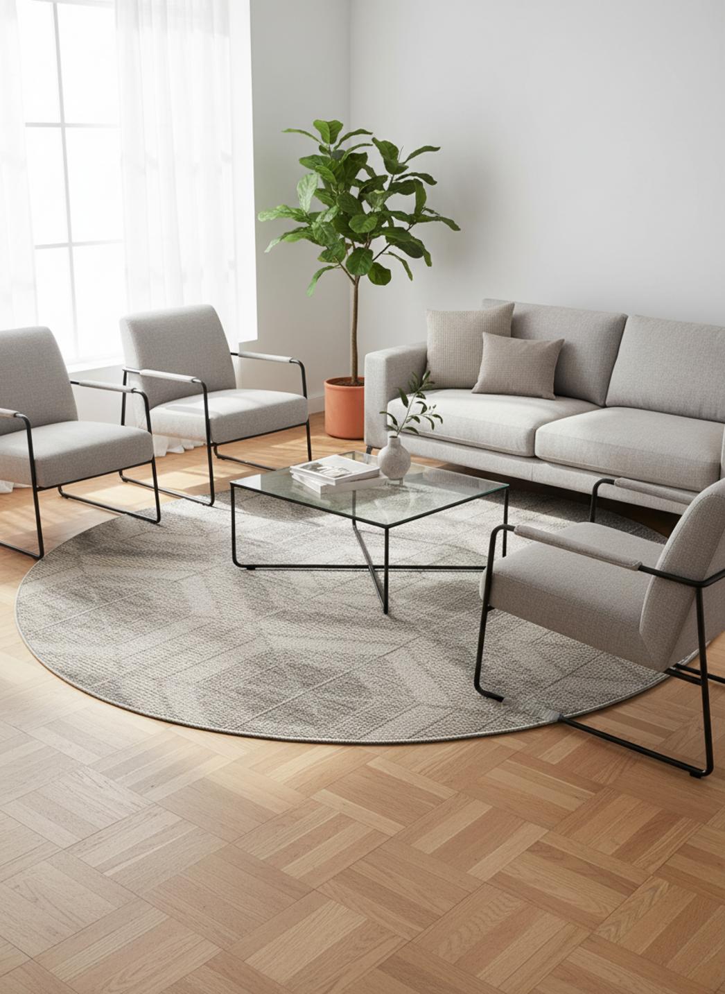 La palette tirée vers le gris module la lumière et crée une ambiance scandinave discrète. Les tonalités neutres apportent une profondeur feutrée sans écraser la pièce. Le contraste subtil entre les nuances souligne la géométrie du dessin et laisse respirer les volumes, donnant au sol une élégance tranquille et contemporaine.