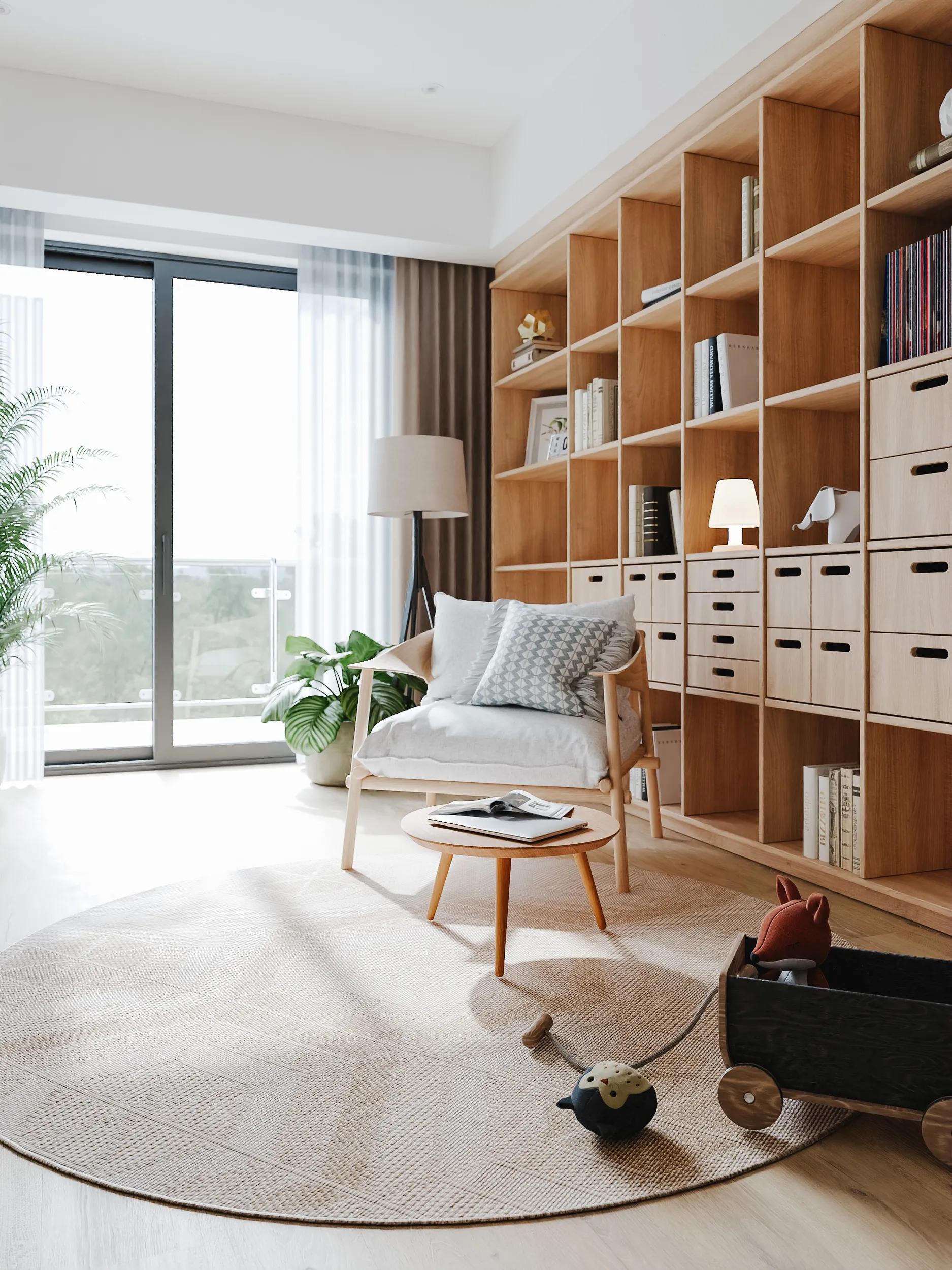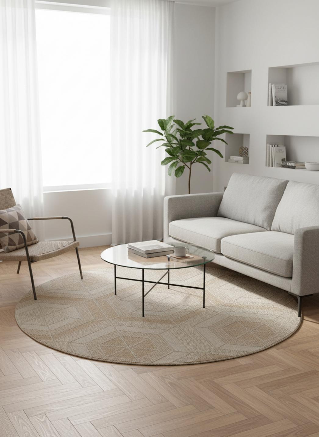 Au centre de la pièce, la forme rond joue le rôle d’ancrage et transforme le regard. Ce cercle s’affirme comme un foyer visuel de 160 cm posé au sol, un point qui invite à la contemplation et à la conversation. La rondeur adoucit les angles du mobilier et offre un contraste harmonieux avec les lignes droites d’une table ou d’une bibliothèque.