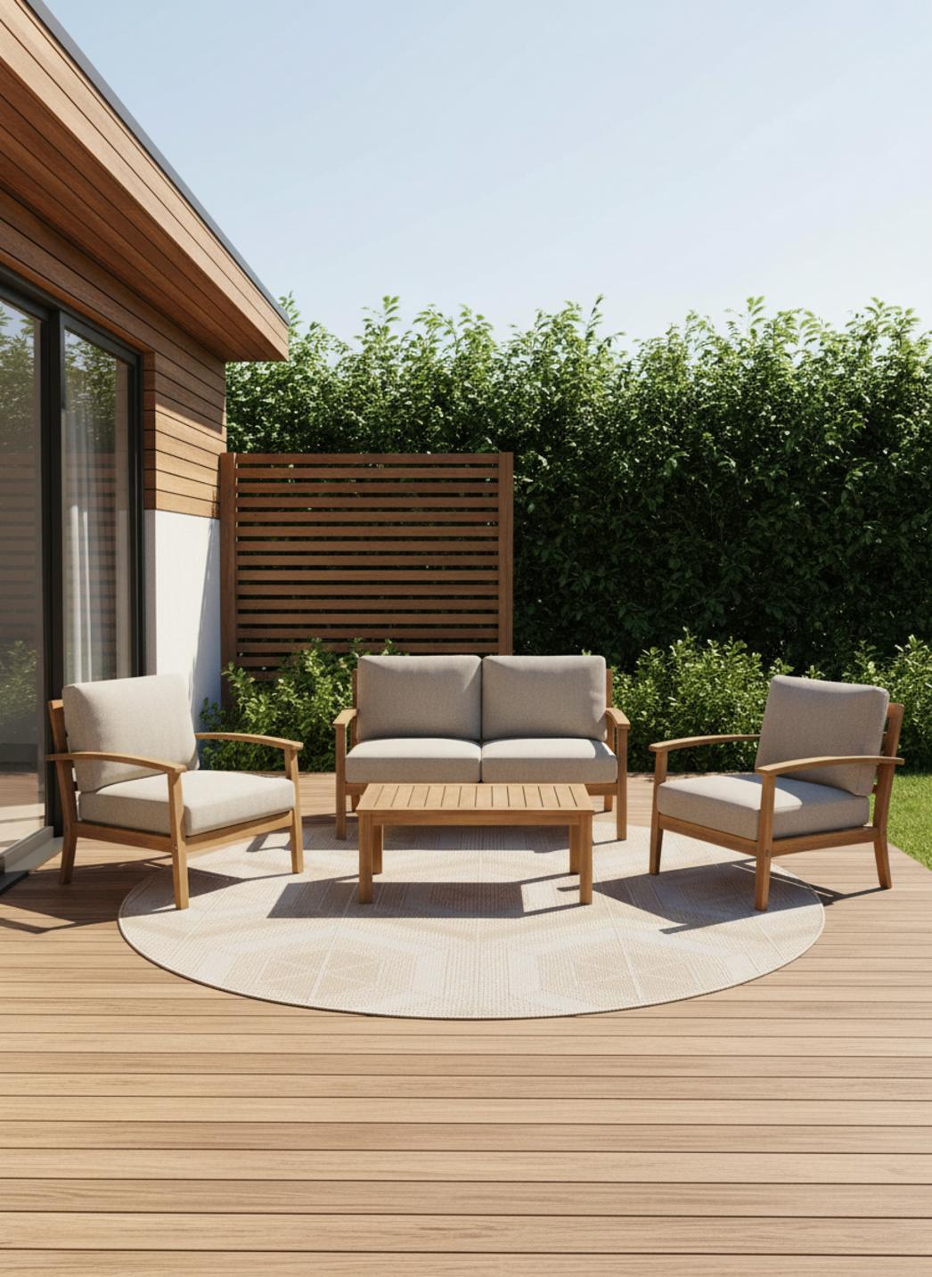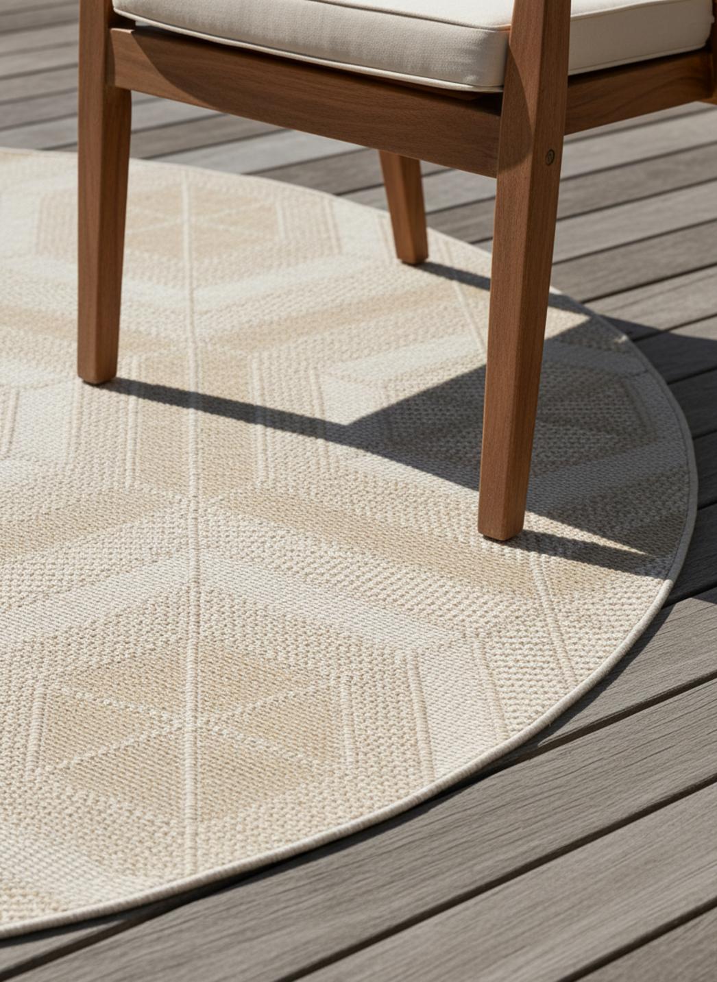 Pensé pour circuler entre confort et résistance, ce tapis s’adapte aussi bien à l’intérieur qu’à l’extérieur, et redéfinit l’usage de chaque zone. Posé sous une table basse, il structure le salon ; placé près d’une baie vitrée, il prolongera la terrasse. La présence du motif transforme la pièce en paysage ordonné, offrant un axe visuel qui guide le mouvement.