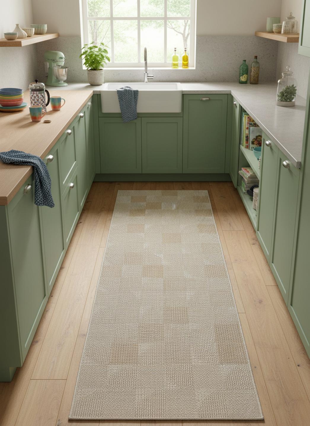 Tapis géométrique motif patchwork de couloir beige d'intérieur et d'extérieur 80x250 cm