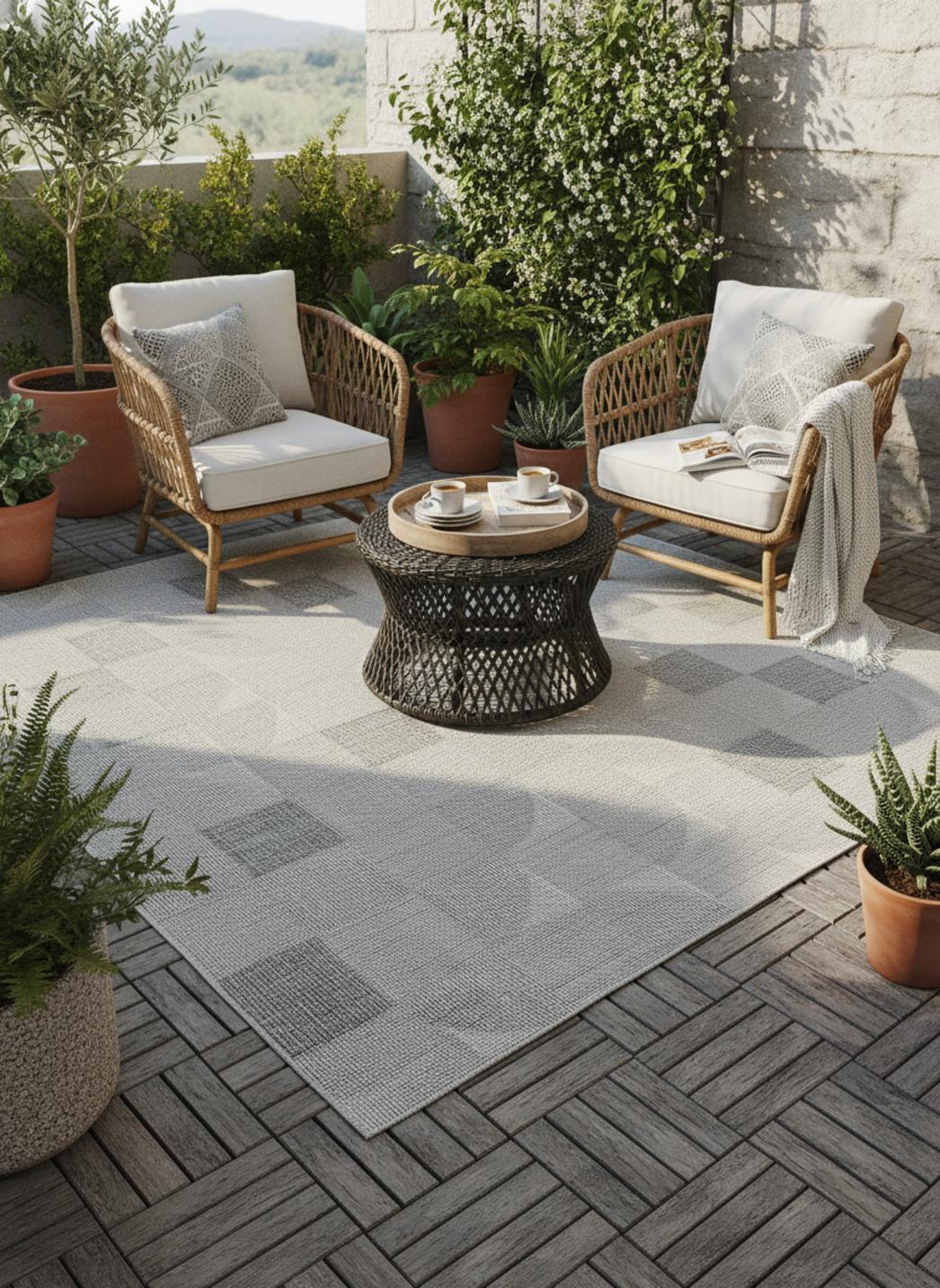 Sur un balcon, une terrasse ou près d’une baie vitrée ouverte sur le jardin, ce tapis géométrique au motif patchwork gris attire le regard par la subtilité de ses formes et la douceur de ses contrastes. Son dessin mosaïque, fait d’assemblages graphiques et harmonieux, compose une surface vivante où chaque nuance semble dialoguer avec la lumière du jour. Le gris, à la fois neutre et profond, installe un climat calme et structuré, parfait pour des espaces extérieurs où l’on recherche une touche de modernité discrète. Son format 80x150 cm s’adapte aux lieux plus intimes, qu’il s’agisse d’un balcon urbain ou d’un petit coin repas extérieur. Les variations du motif patchwork donnent du relief sans excès, jouant sur la répétition et le contraste pour créer une présence équilibrée. Ce tapis gris s’accorde naturellement avec les matières minérales, le bois clair ou les textiles naturels, ajoutant une note graphique raffinée à l’ensemble. Il évoque une atmosphère paisible, un lieu où les formes s’harmonisent comme une composition douce et contemporaine. Une pièce qui transforme les petits espaces extérieurs en décors pensés, accueillants et empreints de sérénité.