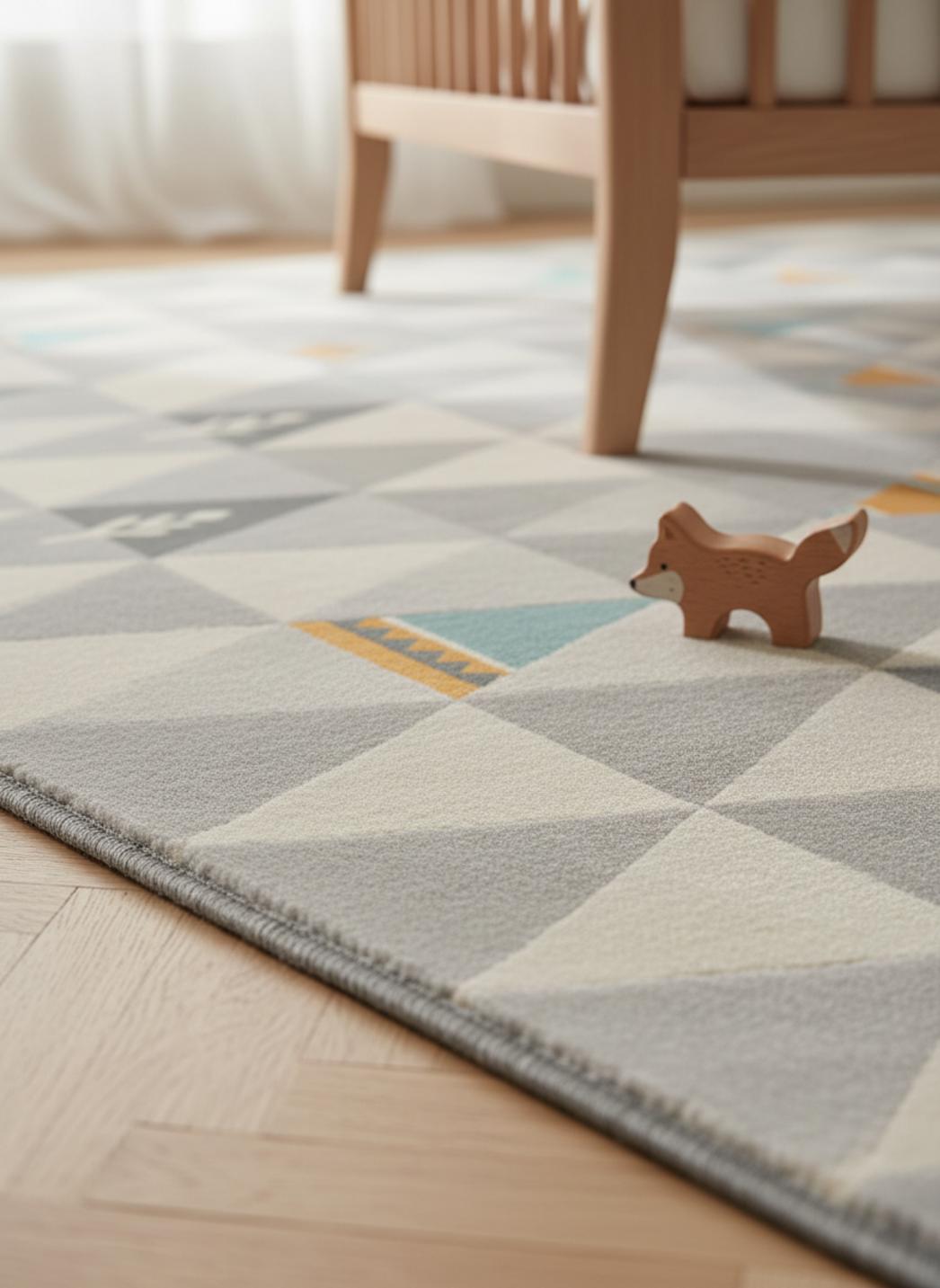 Les tonalités choisies apportent une atmosphère apaisante et adaptable à l'ensemble de la décoration, et les teintes beige et gris se marient avec des murs pastel, une lampe douce et des textiles en superposition, renforçant l'idée d'un cocon familial où tout est pensé pour le bien-être. La stabilité du tapis permet aussi d'y installer un coin lecture sécurisé, avec un plaid et une pile de livres préférés.