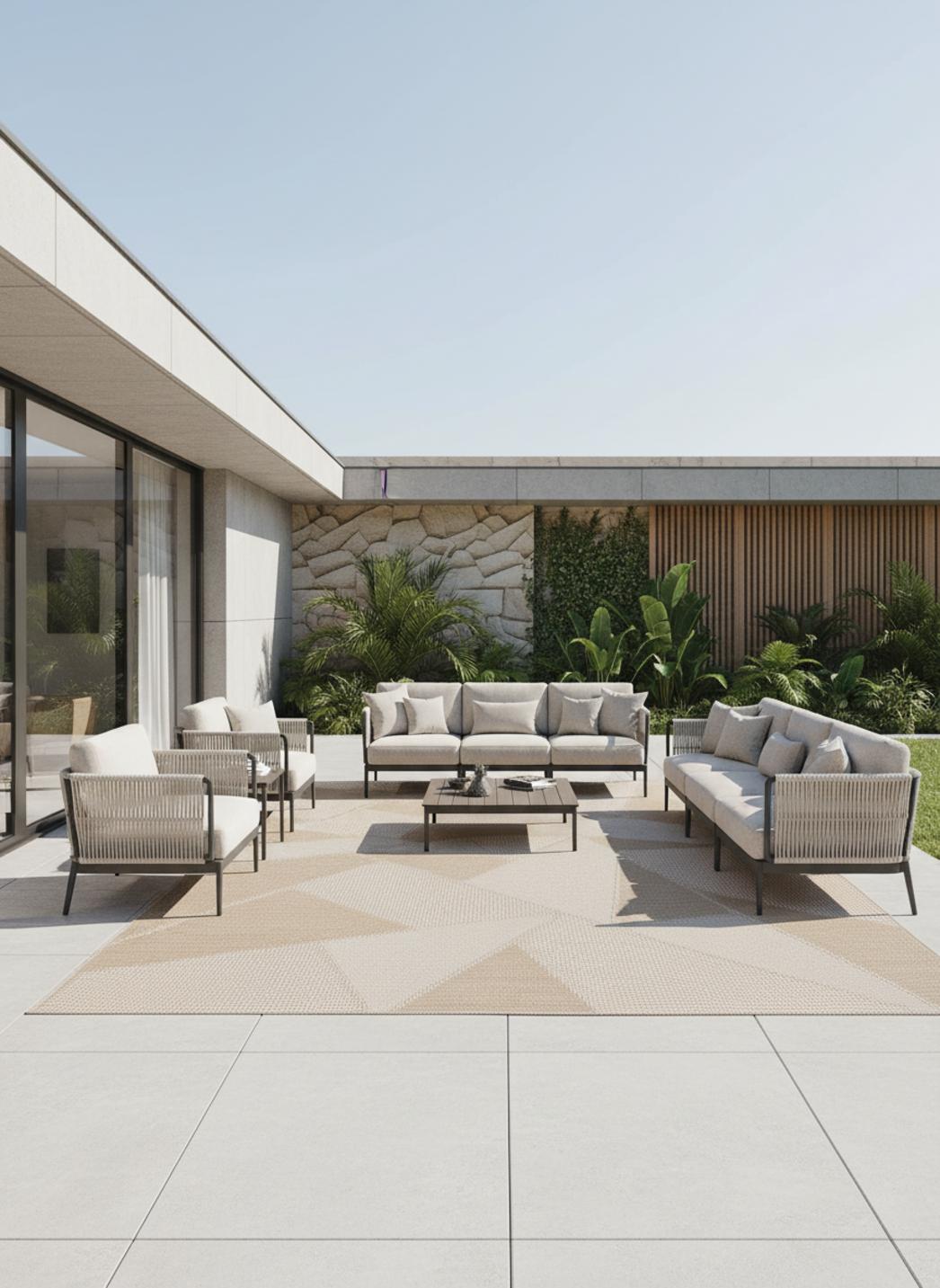 Pensé pour occuper un large espace, ce format affirme sa présence sans saturer la pièce. Le grand format de 300x400 cm structure le salon comme un cadre architectural, souligne un canapé et recentre la conversation. Conçu pour l’usage en intérieur comme en extérieur, il module la lumière et la profondeur selon la place qu’on lui donne, qu’il serve à définir un coin repas ou à prolonger une terrasse abritée.