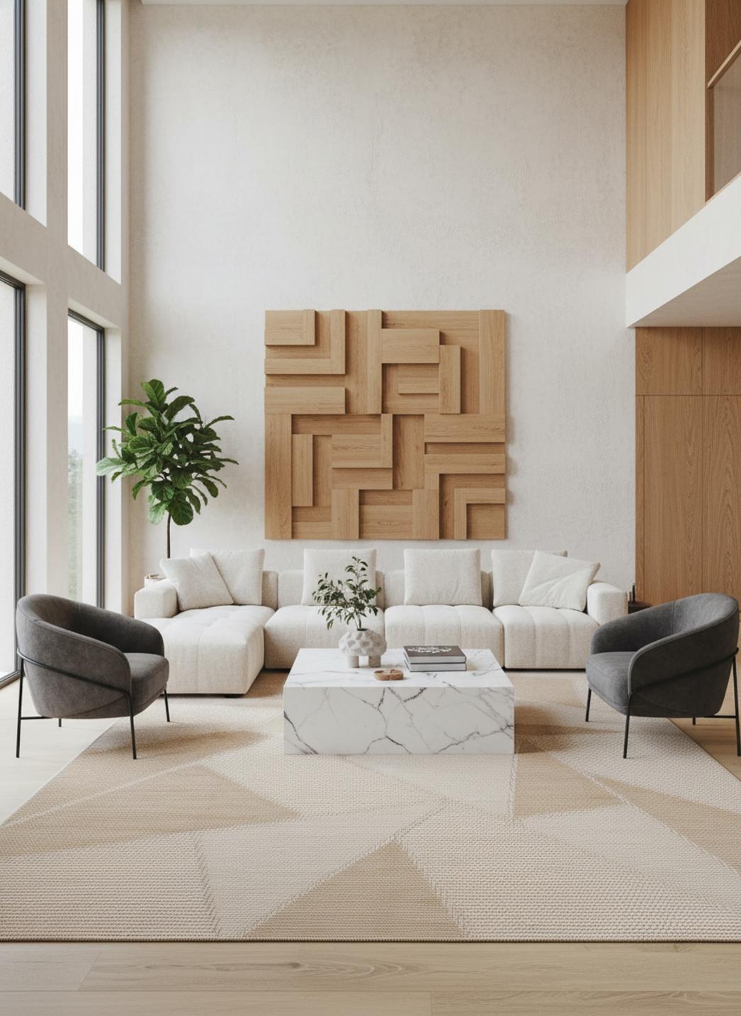 Les répétitions triangulaires instaurent une géométrie en mouvement : directions qui se croisent, nappes d’ombre et d’aplat qui composent des champs visuels. L’alternance de surfaces pleines et d’espaces aérés crée un balancement, une respiration graphique qui dynamise à la fois un intérieur moderne et une ambiance plus scandinave. Les contours nets apportent une immédiate modernité tandis que l’équilibre des volumes conserve une sensation de calme.