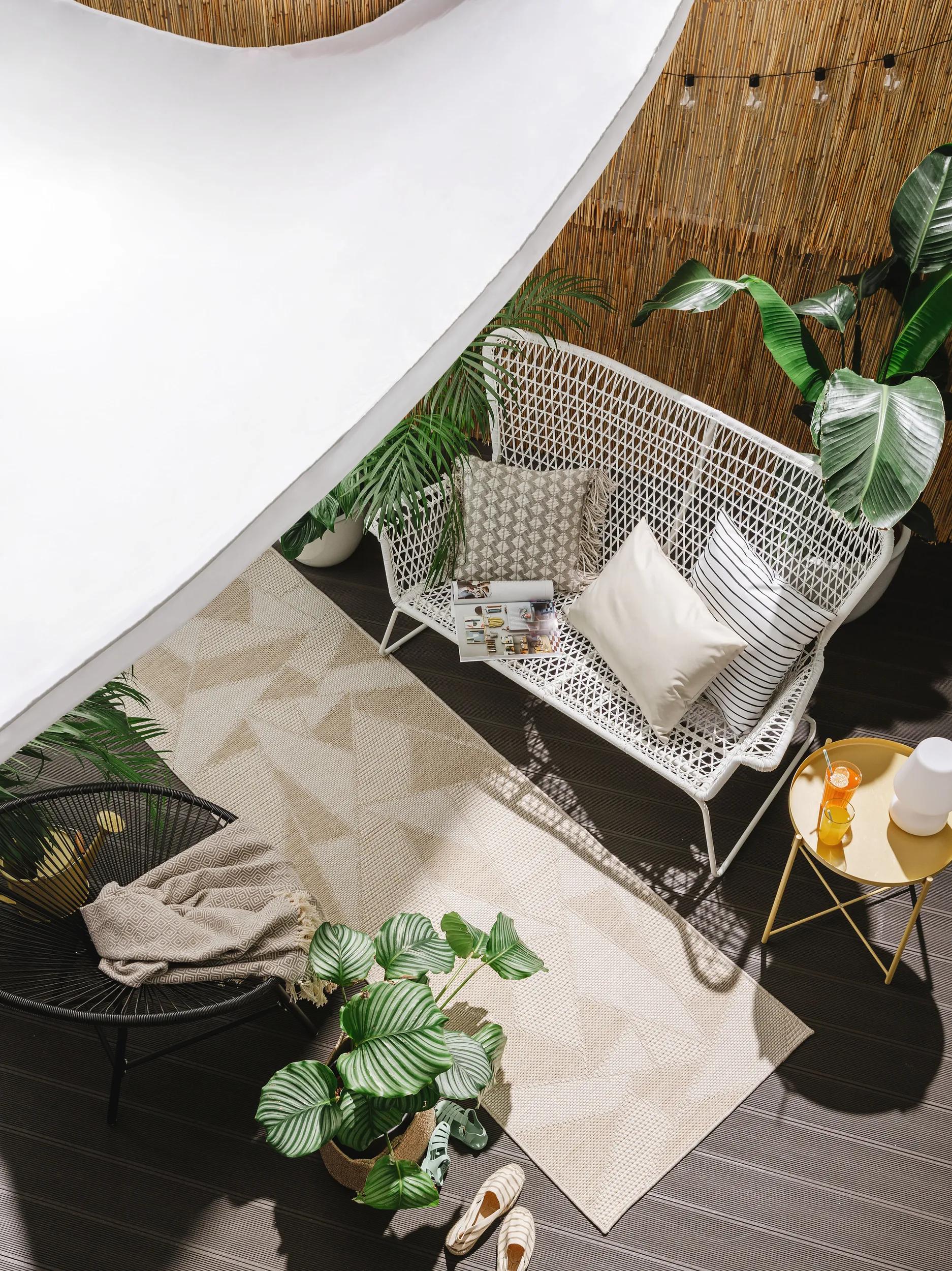 Jeu d’équilibre et de lumière, le tapis géométrique à motif triangle de couloir beige structure l’espace tout en douceur. Ses formes triangulaires s’enchaînent avec régularité, créant une dynamique visuelle fluide qui accompagne le regard le long du passage. Le beige, teinte naturelle et lumineuse, diffuse une chaleur discrète et apaise l’atmosphère. En 80x250 cm, il s’adapte parfaitement aux couloirs ou zones de circulation, reliant avec cohérence intérieur et extérieur. Ce modèle reflète la sobriété élégante des tapis d’extérieur, où la géométrie devient un langage de style subtil. Son tissage à plat joue avec les reflets du jour, donnant au motif une profondeur délicate. On retrouve cette même harmonie lumineuse dans la sélection de tapis de balcon, idéale pour prolonger la clarté et l’équilibre jusque dans les espaces étroits. Un tapis qui transforme la circulation en une promenade douce et apaisée.