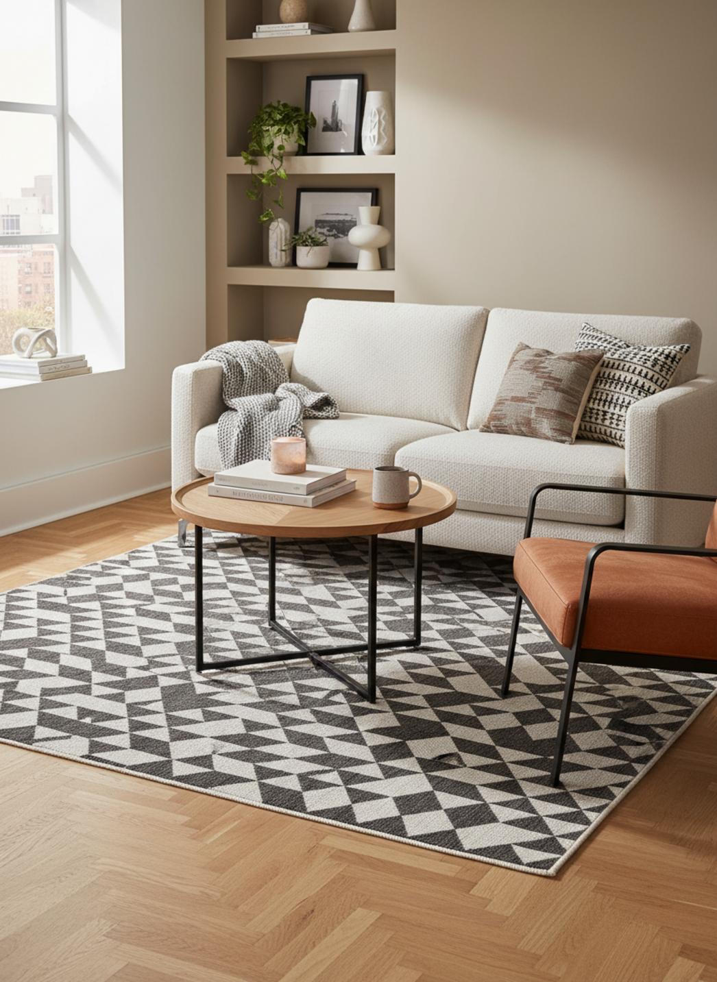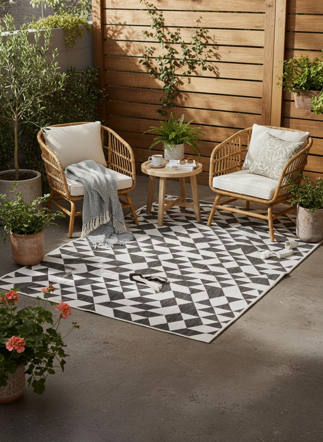 Graphique et contemporain, ce tapis au style géométrique séduit par son motif triangle et le contraste harmonieux de ses tons noir et gris clair. Dans un format de 80x150 cm, il s’intègre parfaitement sur une terrasse, un balcon ou un petit patio, apportant une touche moderne et structurée à la décoration extérieure. Ses triangles réguliers créent un jeu visuel captivant, alliant rigueur et légèreté, idéal pour dynamiser un espace tout en préservant son équilibre. Le noir apporte profondeur et caractère, tandis que le gris clair diffuse une lumière douce et équilibrée, soulignant la finesse du motif. Ce tapis s’accorde aussi bien à des ambiances minimalistes qu’à des décors plus chaleureux, se mariant aisément avec le bois, la pierre ou le rotin. Placé sous une petite table ou dans un coin détente, il structure l’espace avec élégance. Véritable accent de style, il transforme les extérieurs en lieux modernes, sobres et pleins de personnalité.