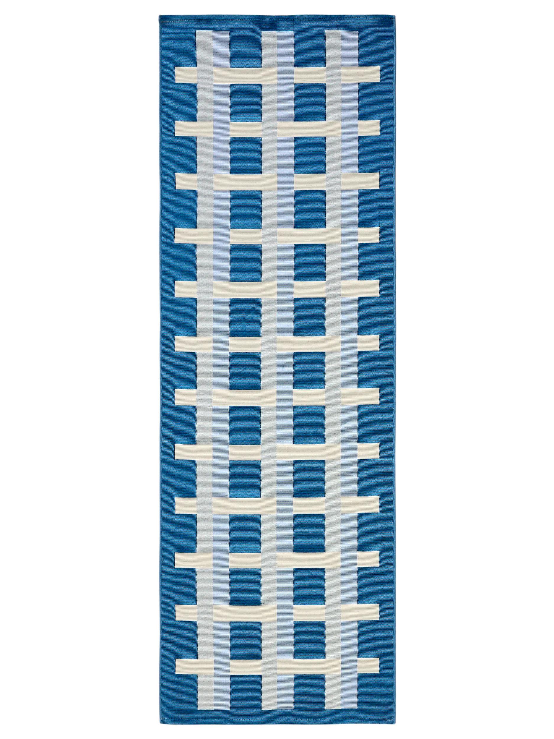 Tapis géométrique quadrillé de couloir bleu et beige d'intérieur et d'extérieur 80x250 cm