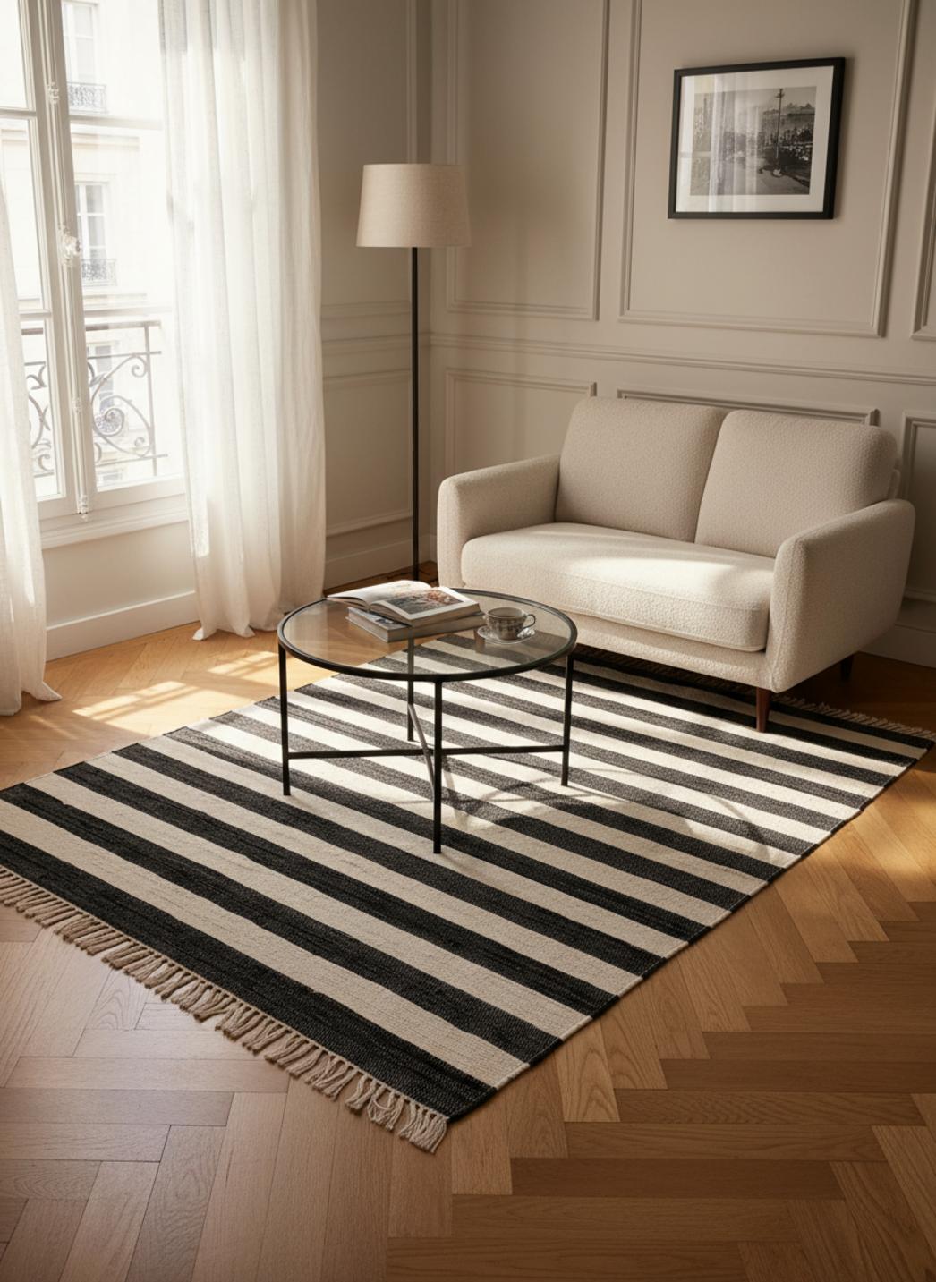 Un contraste immédiat anime la pièce grâce à un tapis où la matrice géométrique se lit comme une partition visuelle. Les bandes alternées jouent la netteté sans agressivité, laissant respirer la matière et les volumes. L’œil suit un rythme continu qui structure l’espace et accentue la profondeur, tandis que la simplicité des formes affirme une signature contemporaine et graphique.