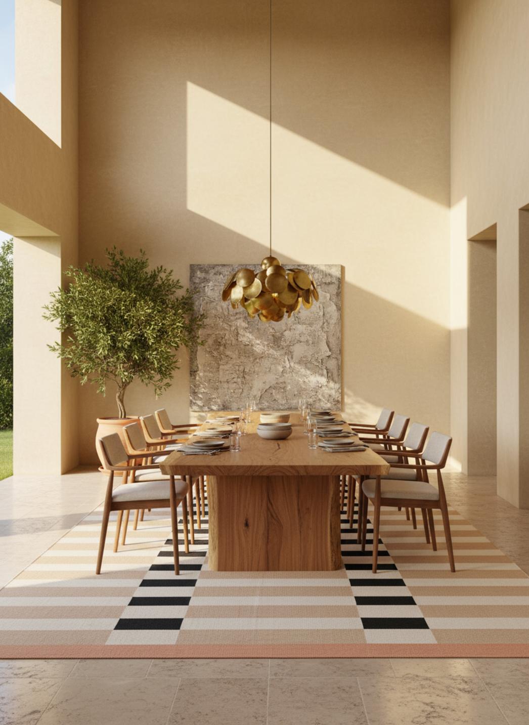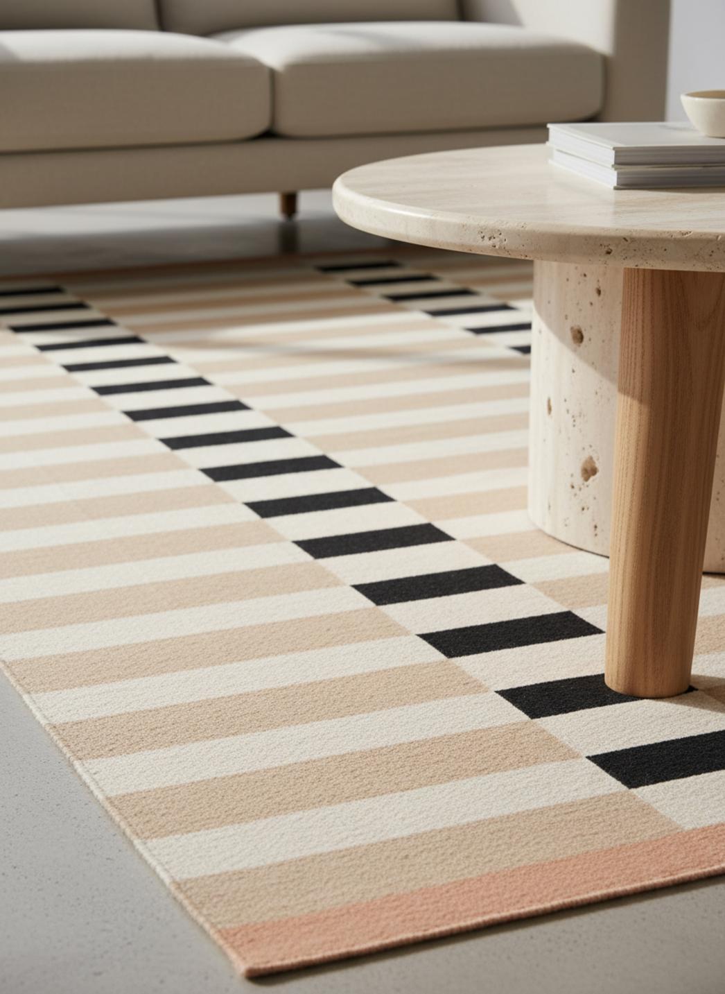 Les lignes parallèles et les plages chromatiques renforcent l'idée d'un motif rayé maîtrisé, à la fois rigoureux et chaleureux. Les traits s'alignent comme des chemins, guidant le déplacement et structurant les zones de mobilier. Cette discipline graphique apporte profondeur et mouvement, transformant un salon en scène ordonnée où chaque élément trouve son équilibre visuel.
