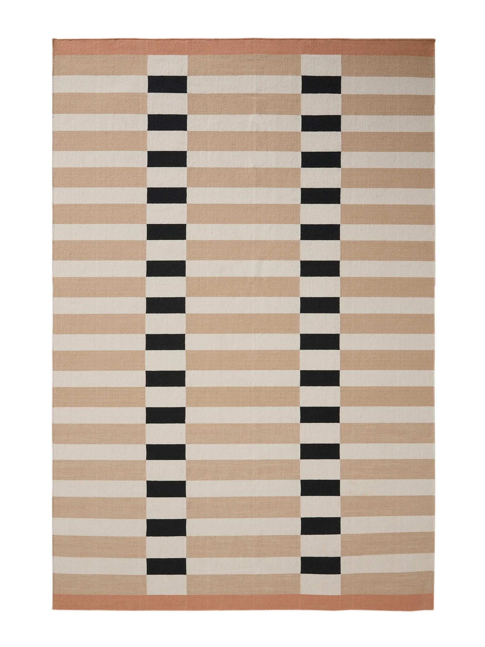 Un grand rythme visuel se déploie au sol grâce à des alternances de bandes nettes et d’espaces respirants, où le propos géométrique se lit comme une partition moderne. Les lignes rayé rencontrent des aplats calmes, créant un dialogue entre mouvement et retenue. Le contraste entre beige et noir sculpte la pièce sans l’agresser, tandis que la taille généreuse souligne un plan au sol qui structure le mobilier.