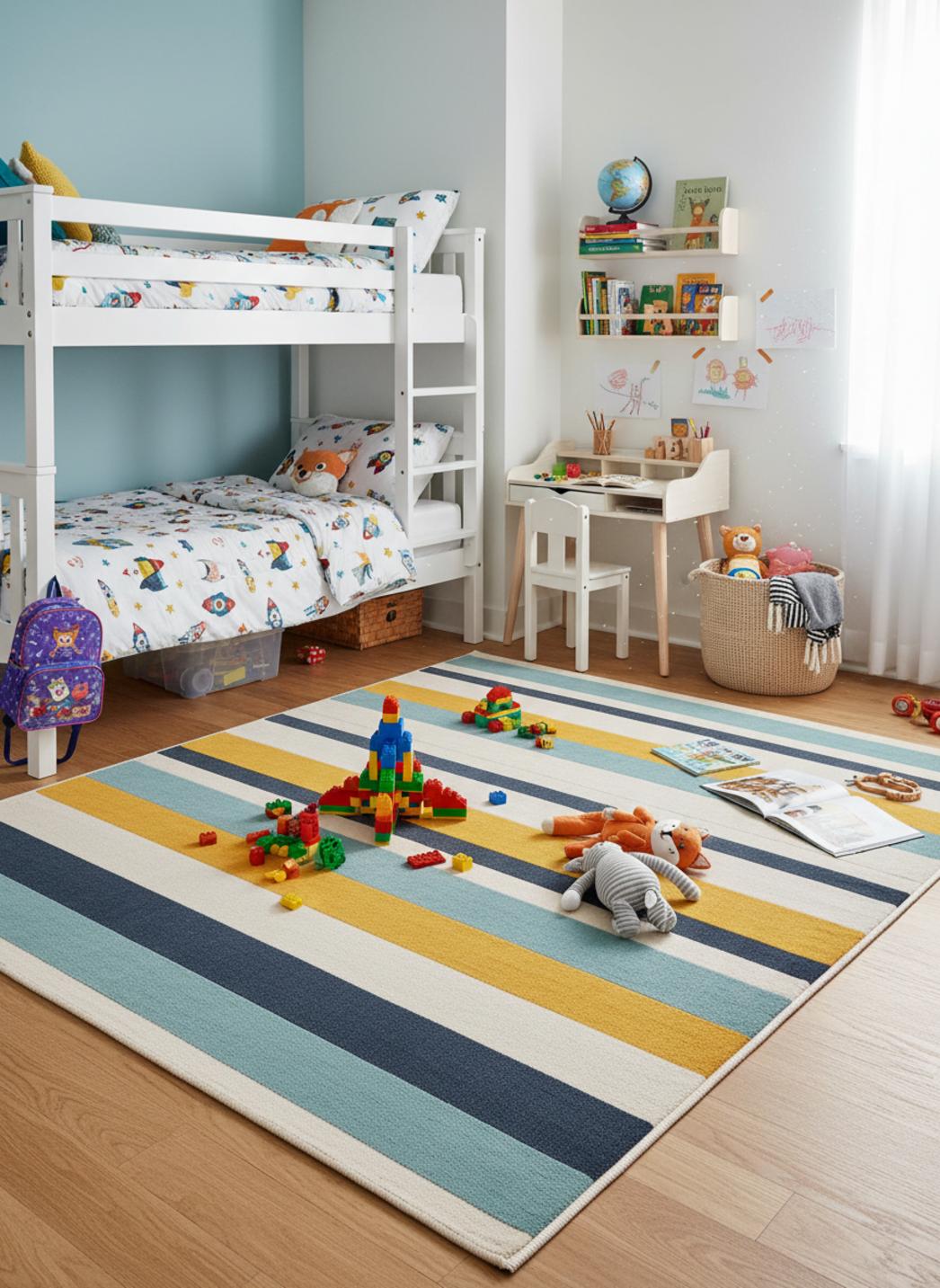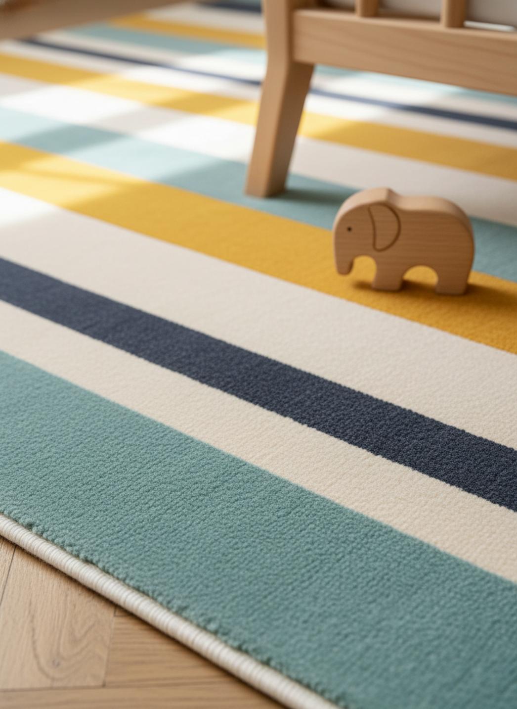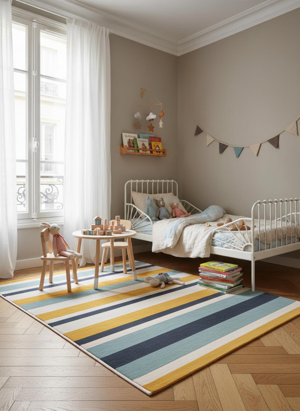 Imaginons le tapis en plein usage : des châteaux de cubes s’élèvent, des histoires sont mimées, des premiers pas se font avec assurance sur un sol qui freine les glissades. Son style rayé apporte une dynamique douce qui stimule l’imagination sans surcharger la chambre, tandis que le motif invite aux jeux de repères et de construction pour les minis explorateurs.