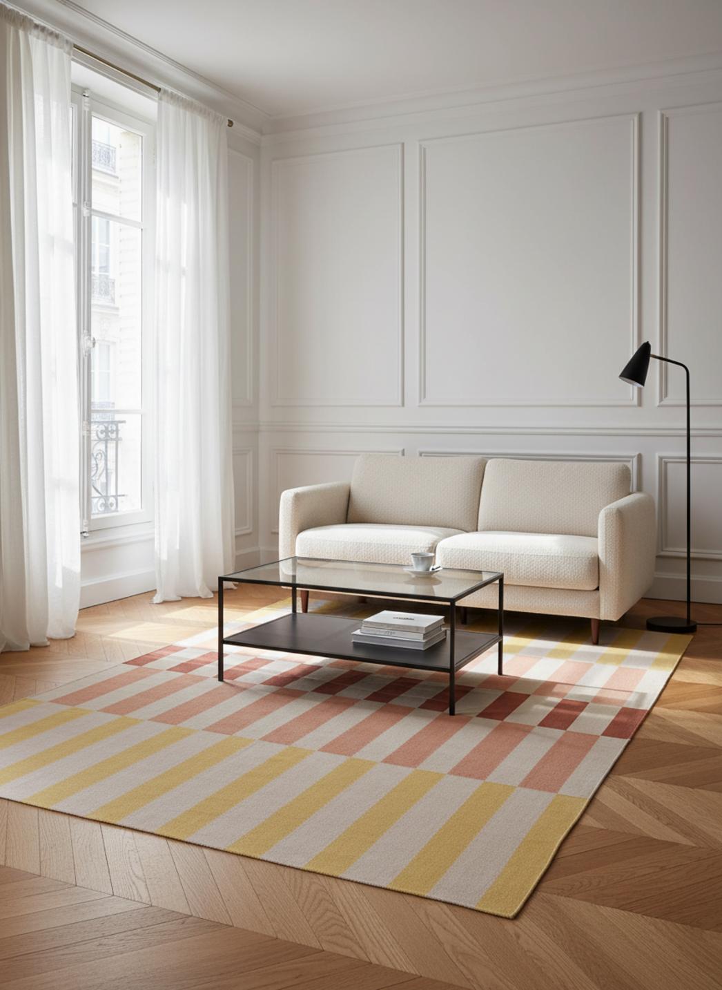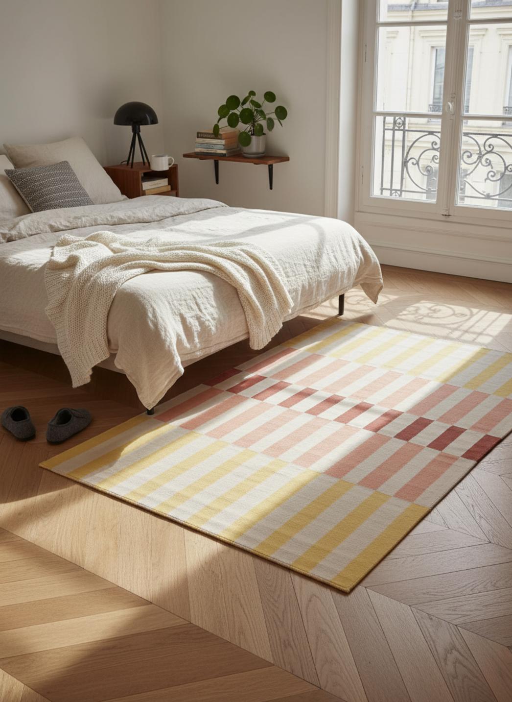 Dans la palette, l’association du rose et du jaune crée un dialogue entre douceur et pep, oscillant entre une atmosphère scandinave et une note plus audacieuse. Les formes s’enchaînent en rythmes répétés, parfois triangulaires, parfois en aplats arrondis, pour composer une esthétique à la fois structurée et vivante. Le contraste entre pleins et vides offre des respirations visuelles qui dynamisent la pièce sans la surcharger.