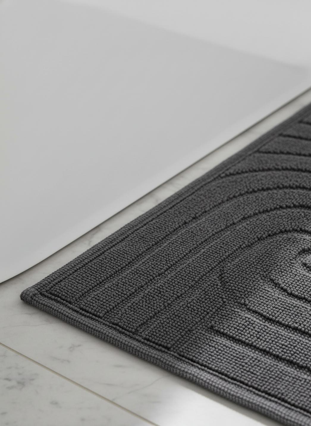 Au cœur de la salle d’eau, le dessin en spirale joue la partition d’un tapis à la fois précis et fluide, où la structure géométrique se fait danse. Les courbes s’enroulent sans surcharge, créant un rythme visuel qui attire le regard et organise l’espace avec élégance.