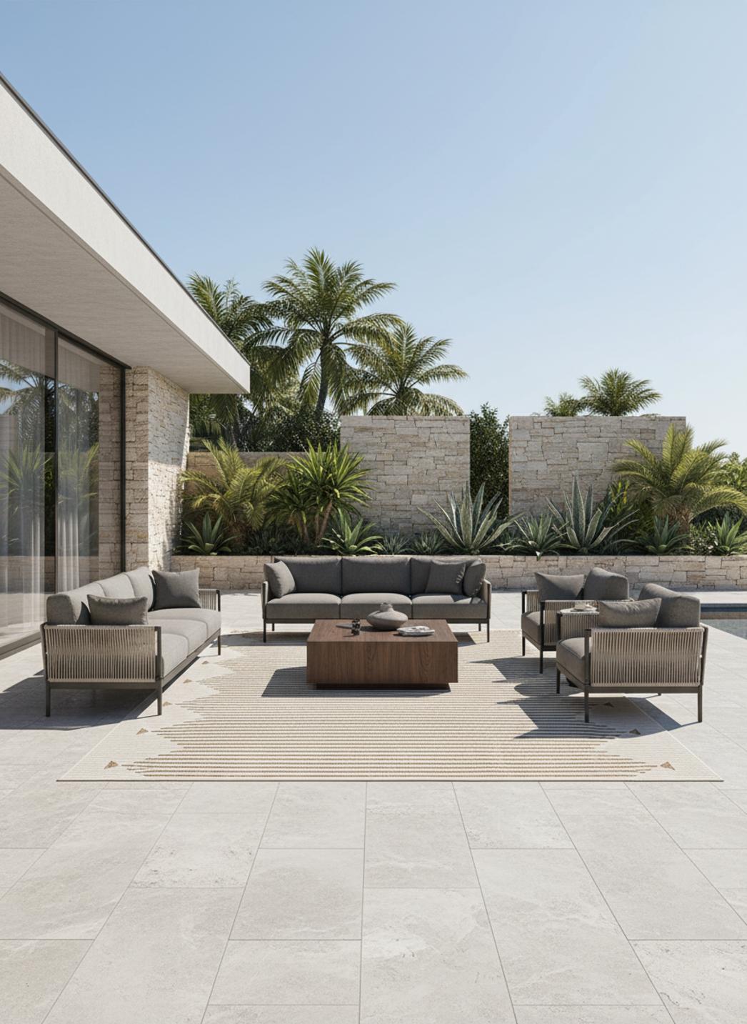 Alliance parfaite entre authenticité et modernité, le tapis géométrique style ethnique crème apporte une douceur raffinée aux grands espaces. Ses motifs d’inspiration artisanale, rythmés avec précision, créent un jeu graphique subtil où la symétrie rencontre la lumière. Le ton crème, chaud et apaisant, diffuse une clarté naturelle qui s’harmonise avec les matières brutes comme le bois ou la pierre. En format 300x400 cm, il habille avec élégance les vastes terrasses, patios ou salons ouverts, reliant intérieur et extérieur dans une continuité sereine. Ce modèle reflète la richesse texturale de la collection de tapis d’extérieur, où les lignes ethniques s’expriment avec sobriété et modernité. Son tissage à plat met en valeur le relief du motif et joue avec les reflets du jour. On retrouve cette même élégance grand format dans la sélection de grands tapis d’extérieur, idéale pour créer des ambiances naturelles et lumineuses. Un tapis qui unit héritage et design dans une sérénité intemporelle.