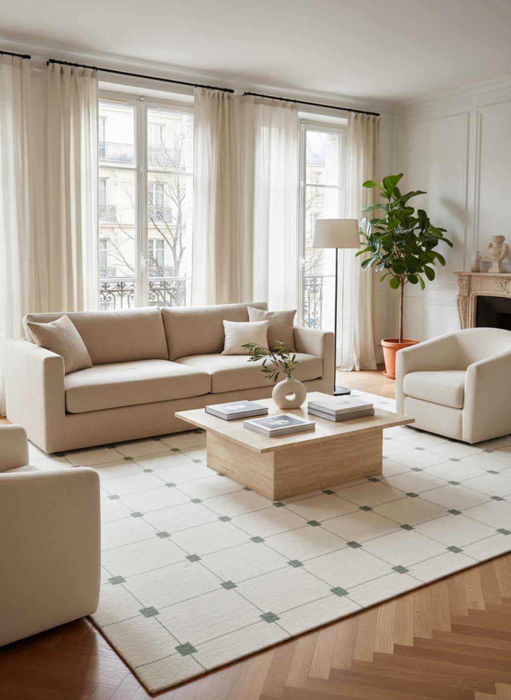 Autour du tapis, la lumière naturelle s’y reflète différemment selon l’angle et l’heure, transformant subtilement les contrastes et révélant des nuances changeantes. L’ensemble se prête autant à un intérieur scandinave qu’à un espace contemporain, apportant une signature visuelle qui rassure et dynamise sans agressivité.