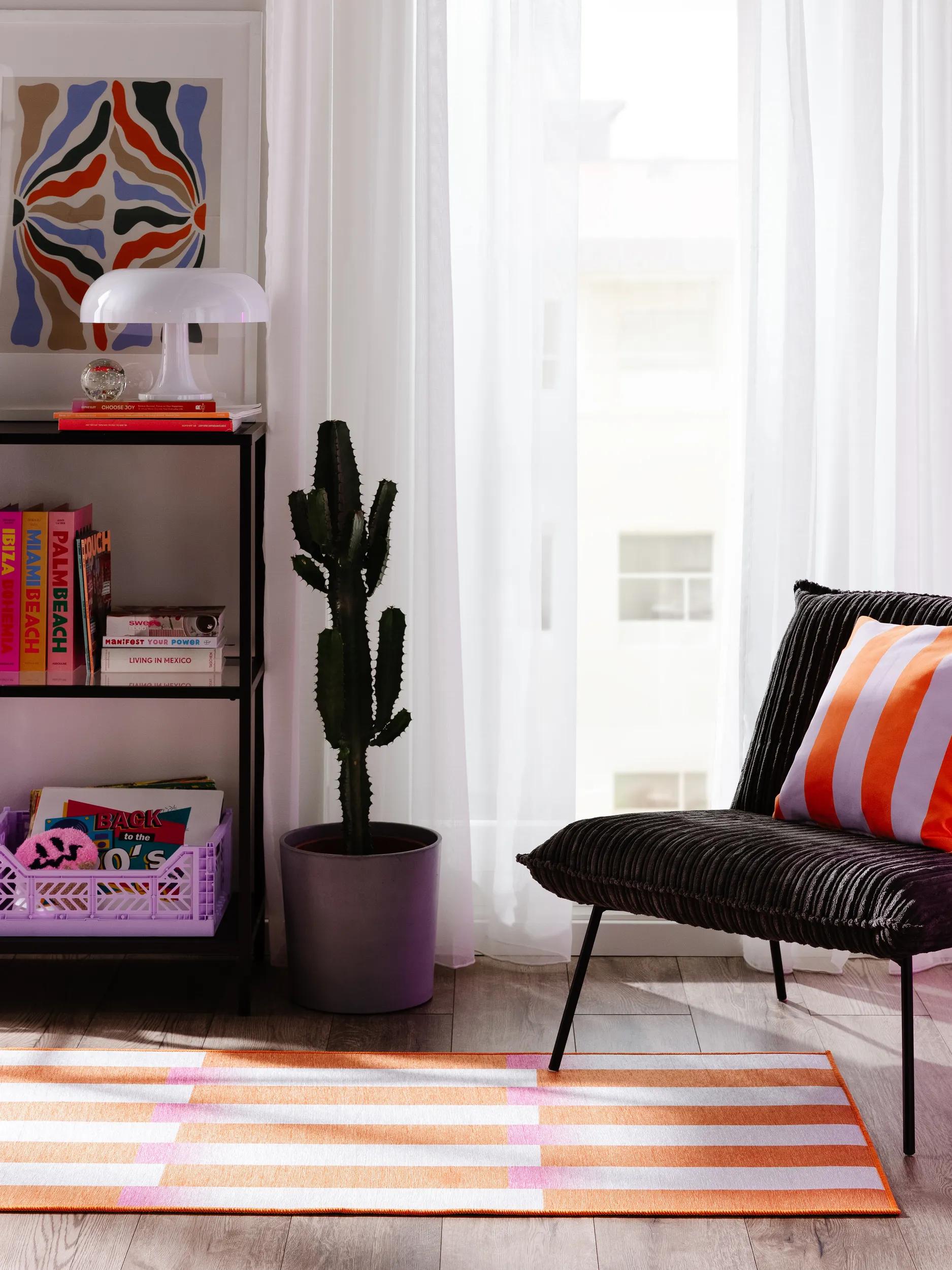Lignes, blocs et formes simples dialoguent ici comme dans une composition rétro assumée. Les motifs puisent dans la mémoire des formes classiques pour les réinterpréter avec légèreté, et la couleur orange vient animer les aplats sans les saturer. Le résultat est une énergie maîtrisée, idéale pour insuffler du mouvement sans déséquilibrer la pièce.