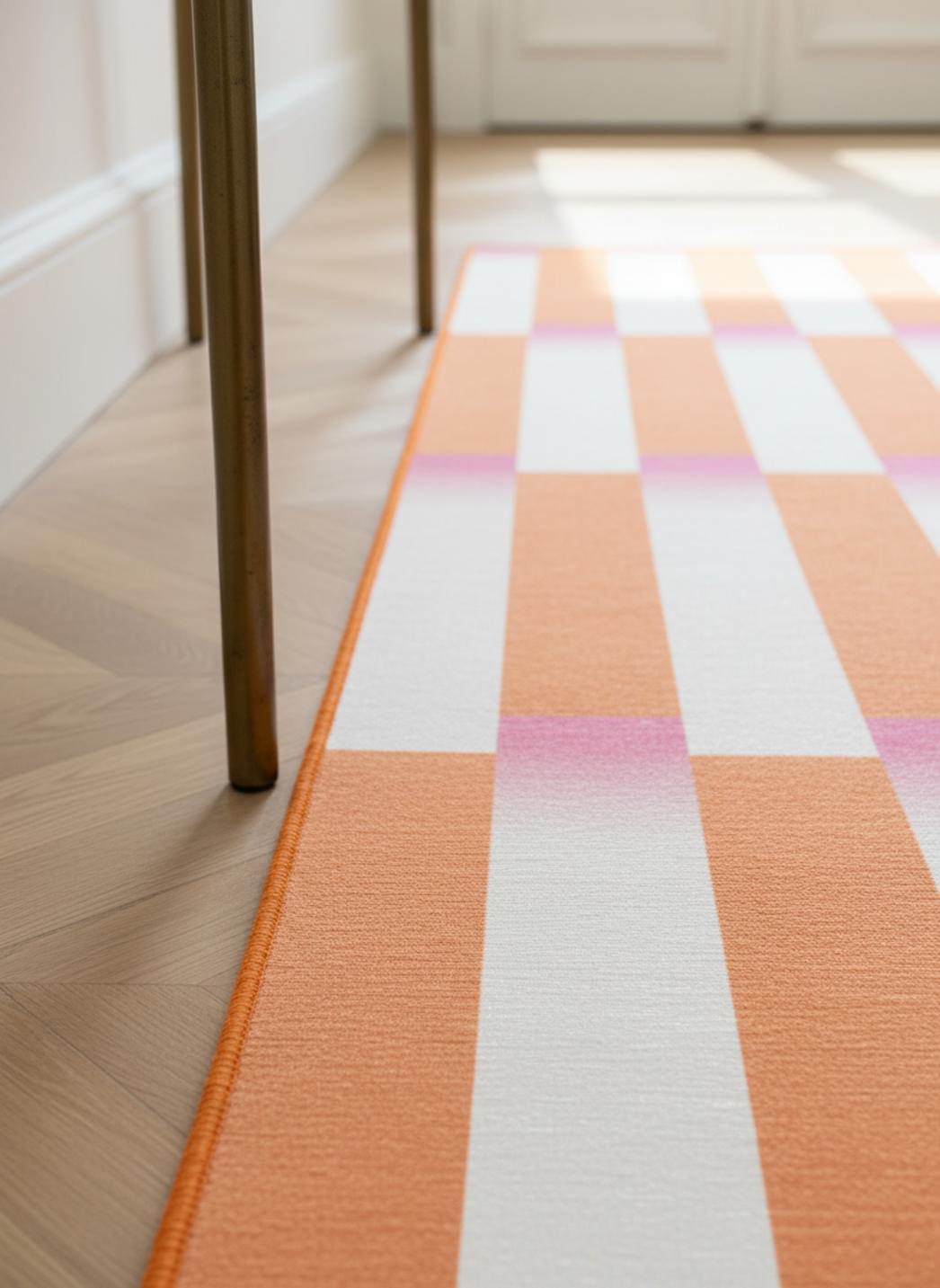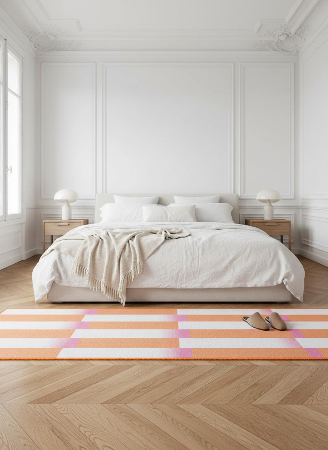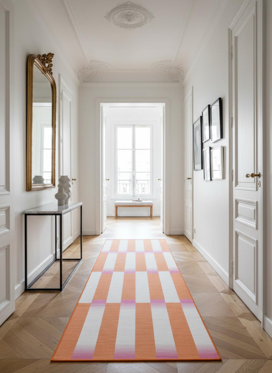 En pratique, il structure une entrée, souligne une enfilade ou vient ponctuer une chambre d’enfant sans dominer. Posé devant une commode, le motif crée un point d’ancrage ; au centre d’un couloir, il organise le mouvement. Sa couleur et son dessin servent à sculpter la lumière et orienter le regard tout en offrant une atmosphère accueillante.
