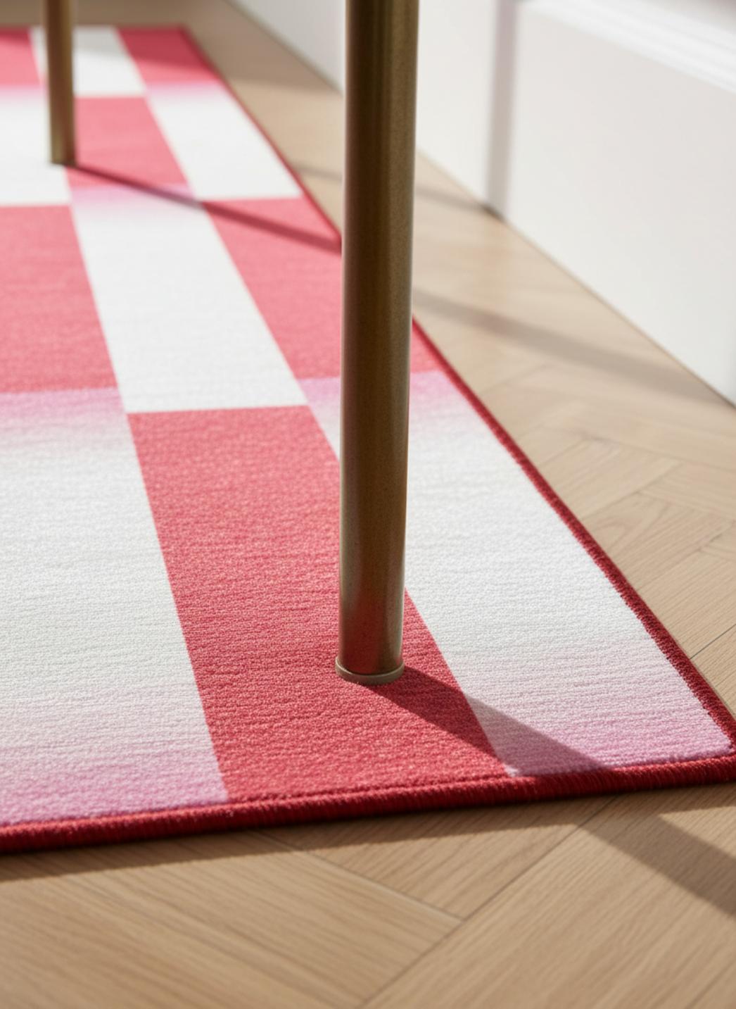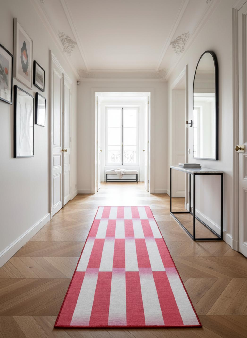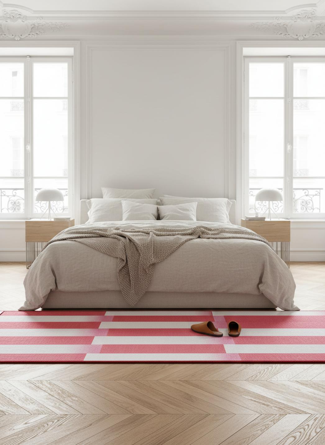 Un contraste visuel s'installe dès le premier pas, où la répétition de formes claires fait vibrer l'espace. Les motifs géométrique jouent entre plein et vide, créant un rythme net et chaleureux. Le duo rouge et blanc impose une présence énergique sans écraser la pièce, comme une partition où chaque forme trouve sa pause.