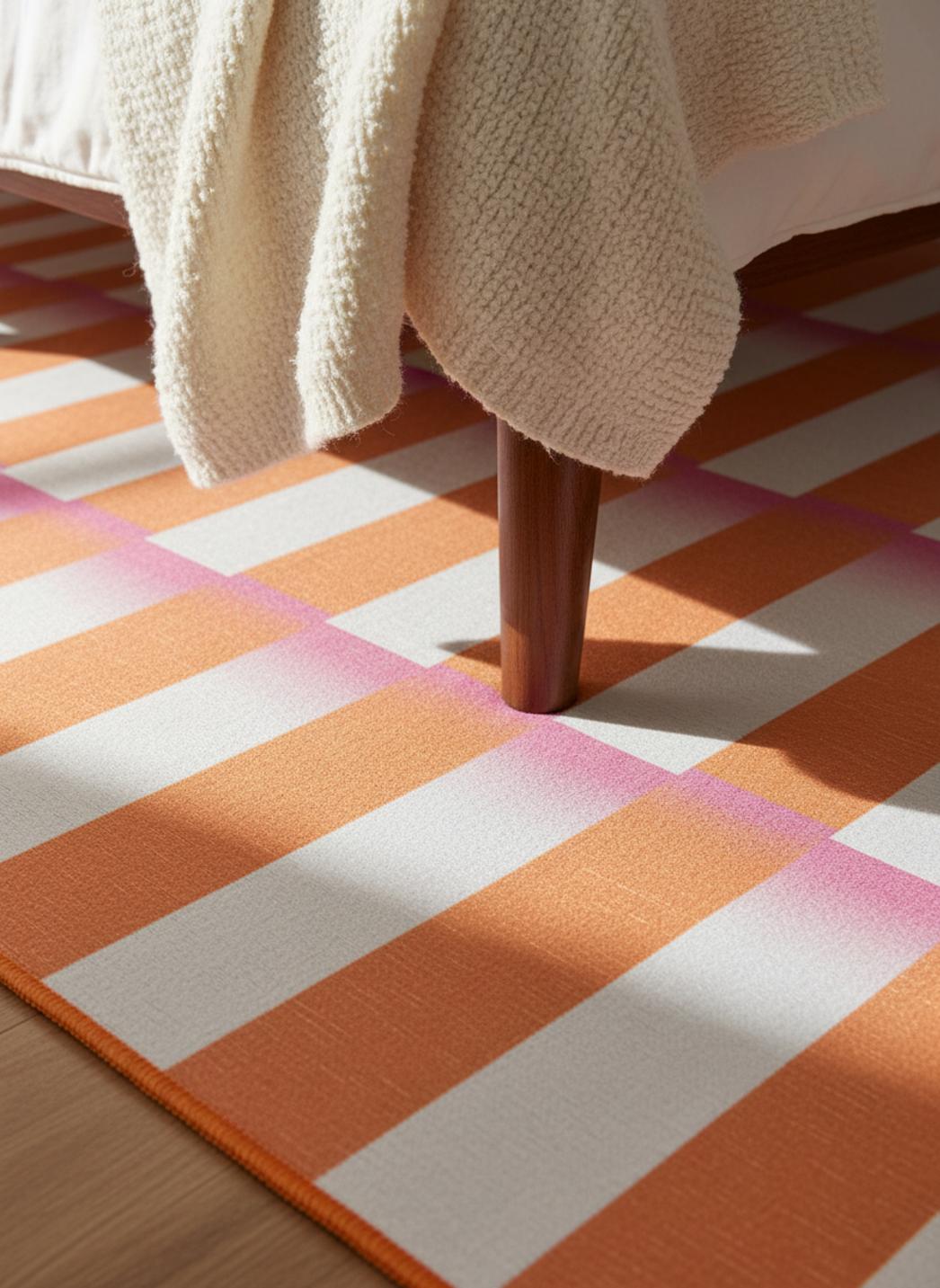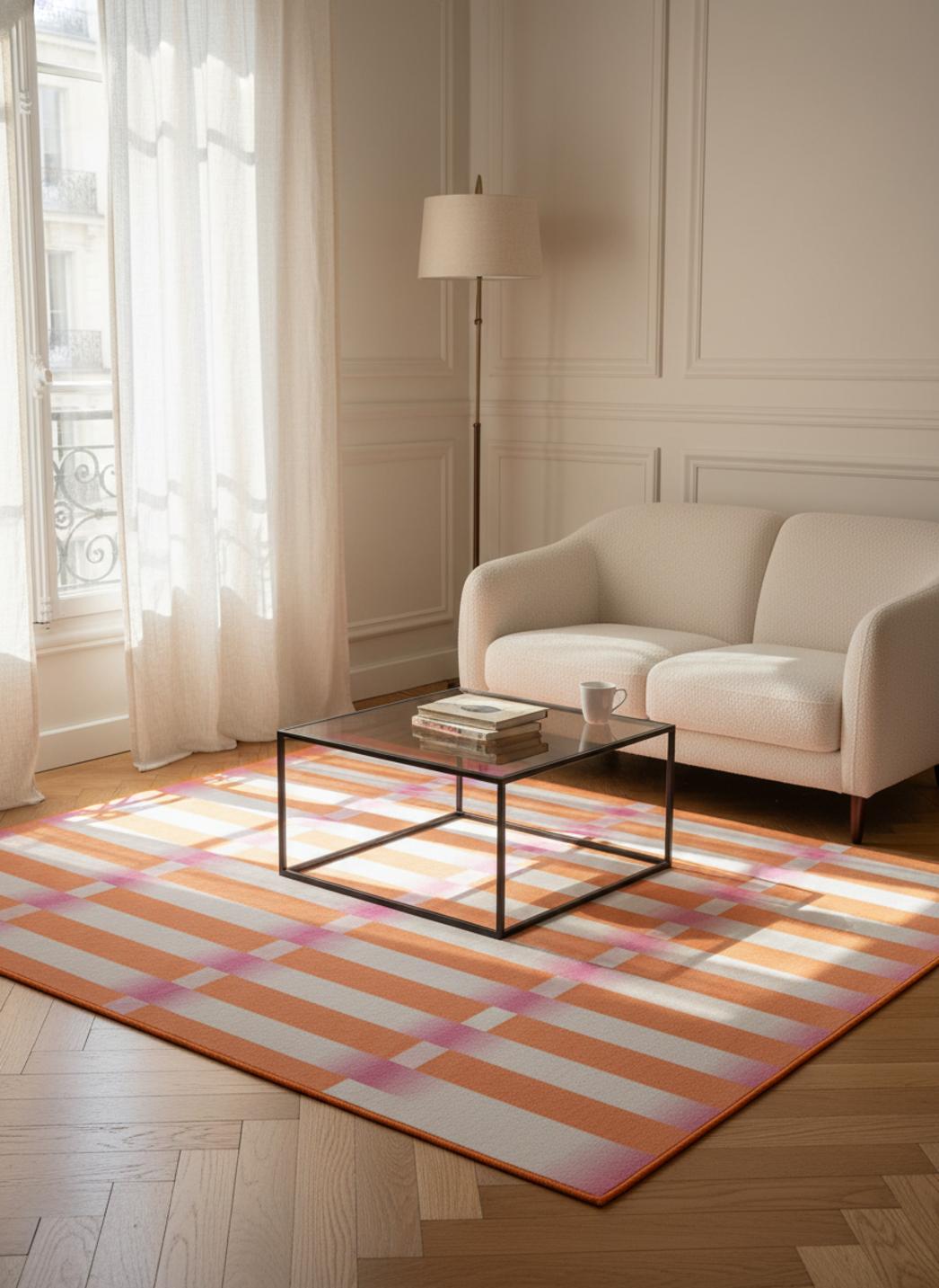 Dans une chambre, il adoucit la sortie du lit en offrant un cocon graphique. En entrée ou sous une console, il structure le passage et guide le regard le long des volumes. L’impact chromatique du orange module l’atmosphère : lumineux en journée, il magnifie les sources artificielles le soir. Les contrastes du dessin intensifient la présence de la pièce sans rompre l’harmonie, créant une ambiance à la fois vivante et reposante.