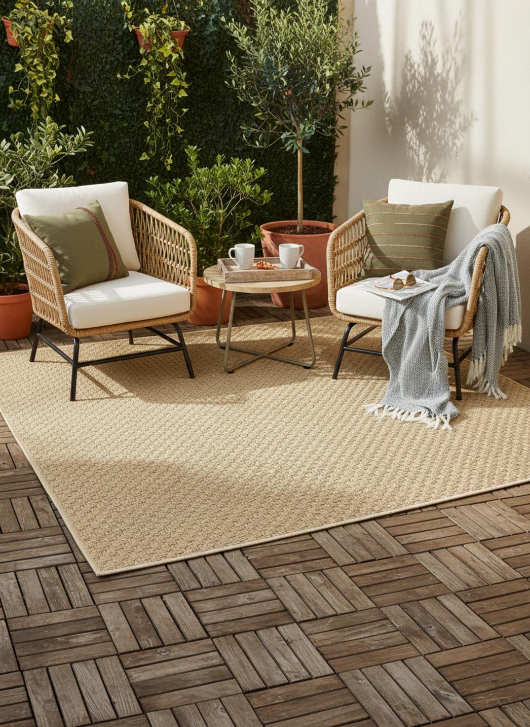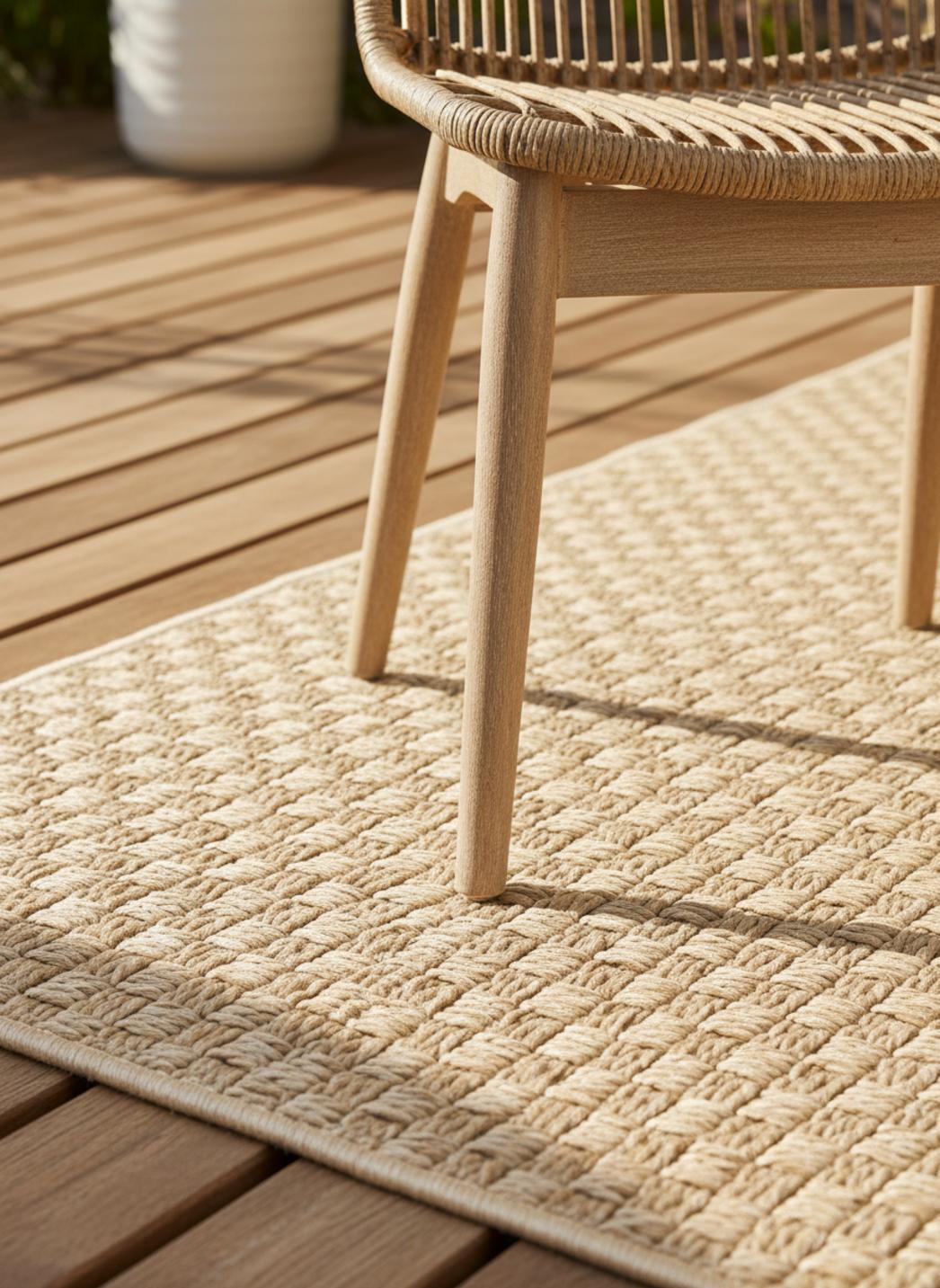 Sobre et chaleureux, ce tapis au motif géométrique tressé à carreaux se distingue par la douceur de sa teinte beige, idéale pour illuminer les petits espaces extérieurs. Avec son format pratique de 77x150 cm, il s’intègre facilement sur un balcon, dans une allée de terrasse ou au pied d’un salon de jardin, apportant une note d’élégance naturelle. Le tressage à carreaux, régulier et raffiné, évoque le travail artisanal tout en offrant une touche contemporaine, parfaite pour structurer un espace sans le figer. Sa couleur beige diffuse une lumière douce et harmonieuse, créant une atmosphère accueillante et apaisante. Ce tapis s’accorde aisément avec les matériaux naturels comme le bois, la pierre ou le rotin, et s’adapte à tous les styles de décoration extérieure, du bohème au moderne. On l’imagine bordant un coin détente, accompagnant une table basse ou soulignant un passage, ajoutant cette touche de raffinement discret qui lie l’ensemble. Un tapis intemporel, à la fois pratique et esthétique, qui transforme les petits extérieurs en lieux de vie lumineux et équilibrés.