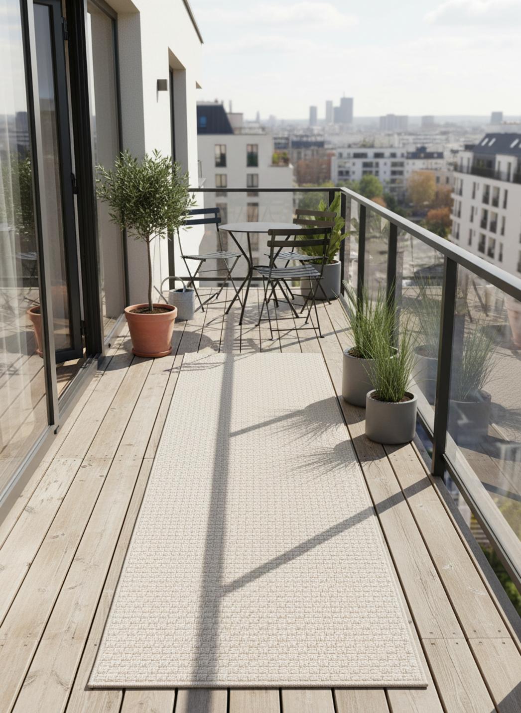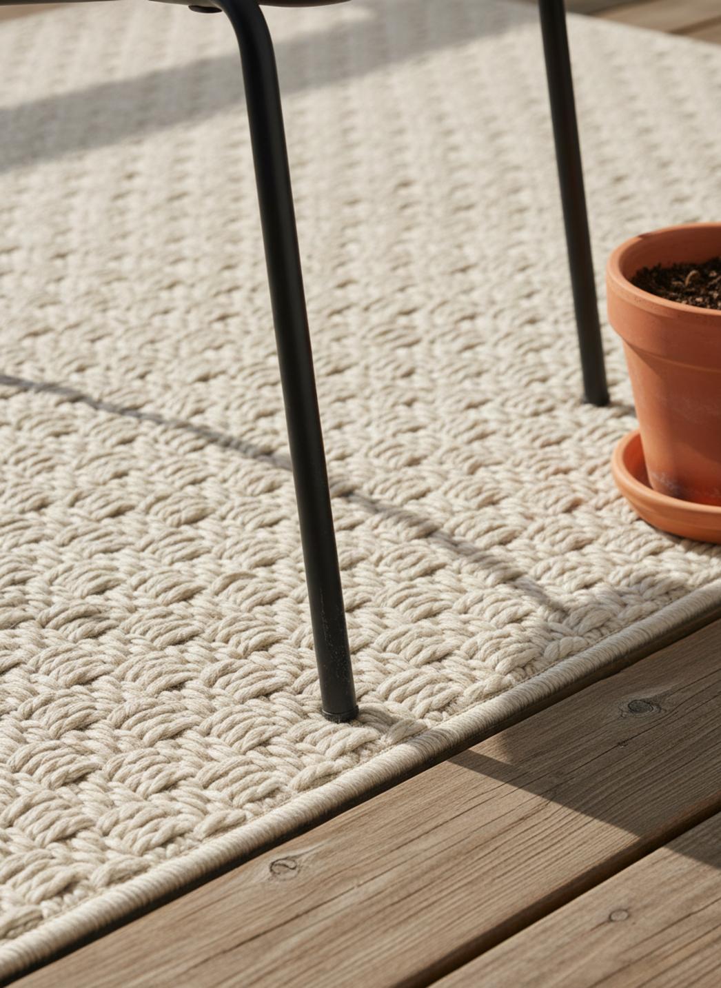 Dans sa fabrication, le tissage met en valeur l’effet tressé, visible au toucher et au regard. Le relief discret capte la lumière et offre une sensation dense mais légère sous le pied. Pensé pour s’inscrire aussi bien en intérieur qu’en extérieur, il propose une présence qui ne domine pas mais qui engage l’espace.