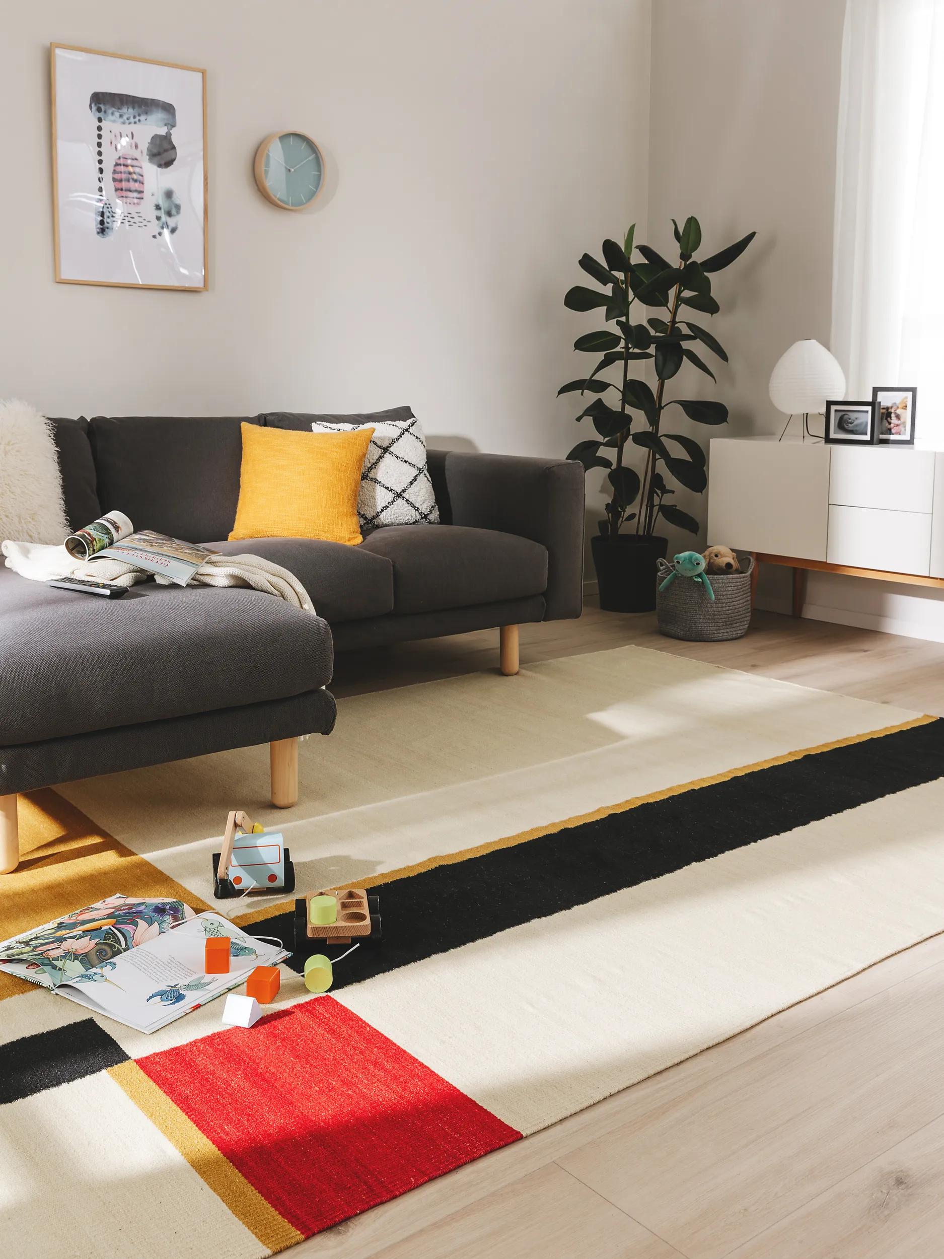 Avec son format 140x200 cm, ce tapis joue un rôle d'ancrage : il structure le salon sous un canapé, délimite un coin lecture ou se glisse au pied du lit pour atténuer la froideur du sol. Sa dimension crée une perspective mesurée, offrant à la fois présence et légèreté, et permet d'exposer les frises et les motifs répétitifs sans écraser l'espace.