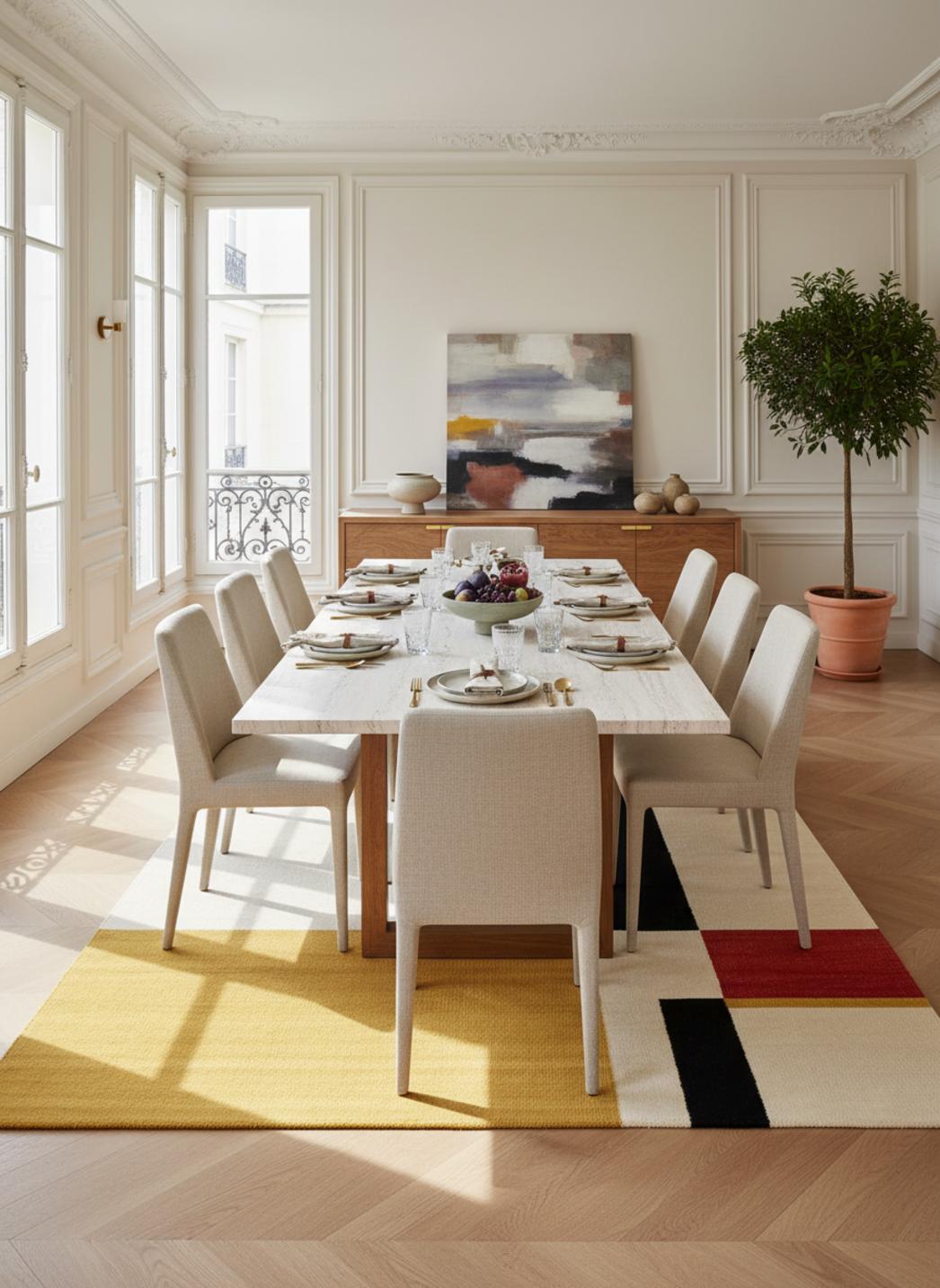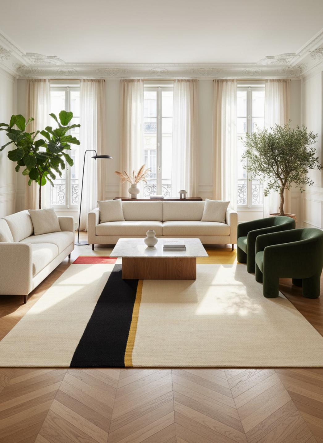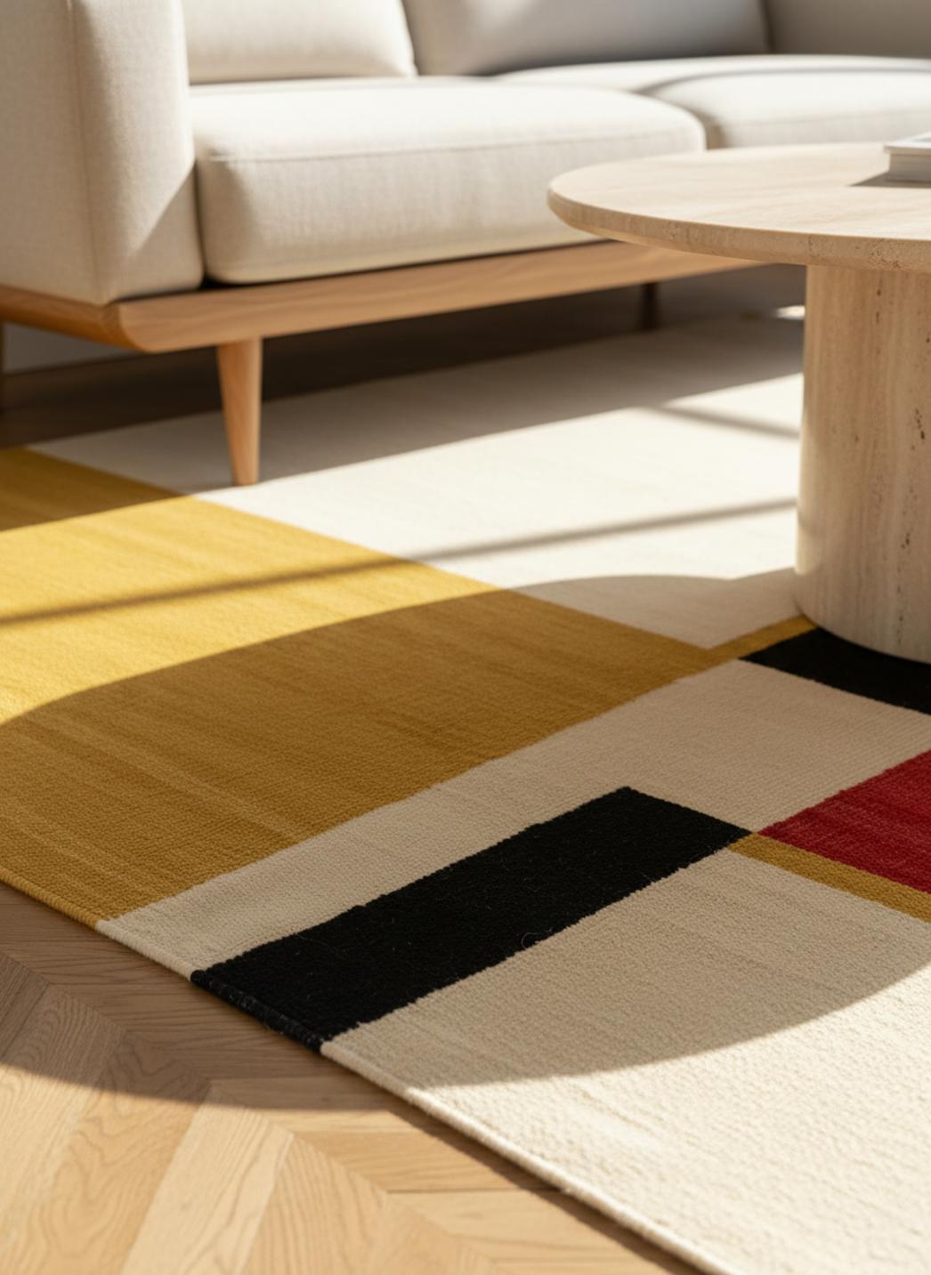 Au premier regard, la rencontre de beige doux et d’accents orange solaire compose une scène chaleureuse où la kilim se lit comme une fresque contemporaine : géométrie kilim mise en tension, motifs répétitifs qui rythment l’œil, frises qui encadrent des symboles stylisés et une texture tissée qui invite au toucher. L’effet est une vraie chaleur visuelle, une lecture graphique multicouche qui murmure l’héritage sans s’y confiner.