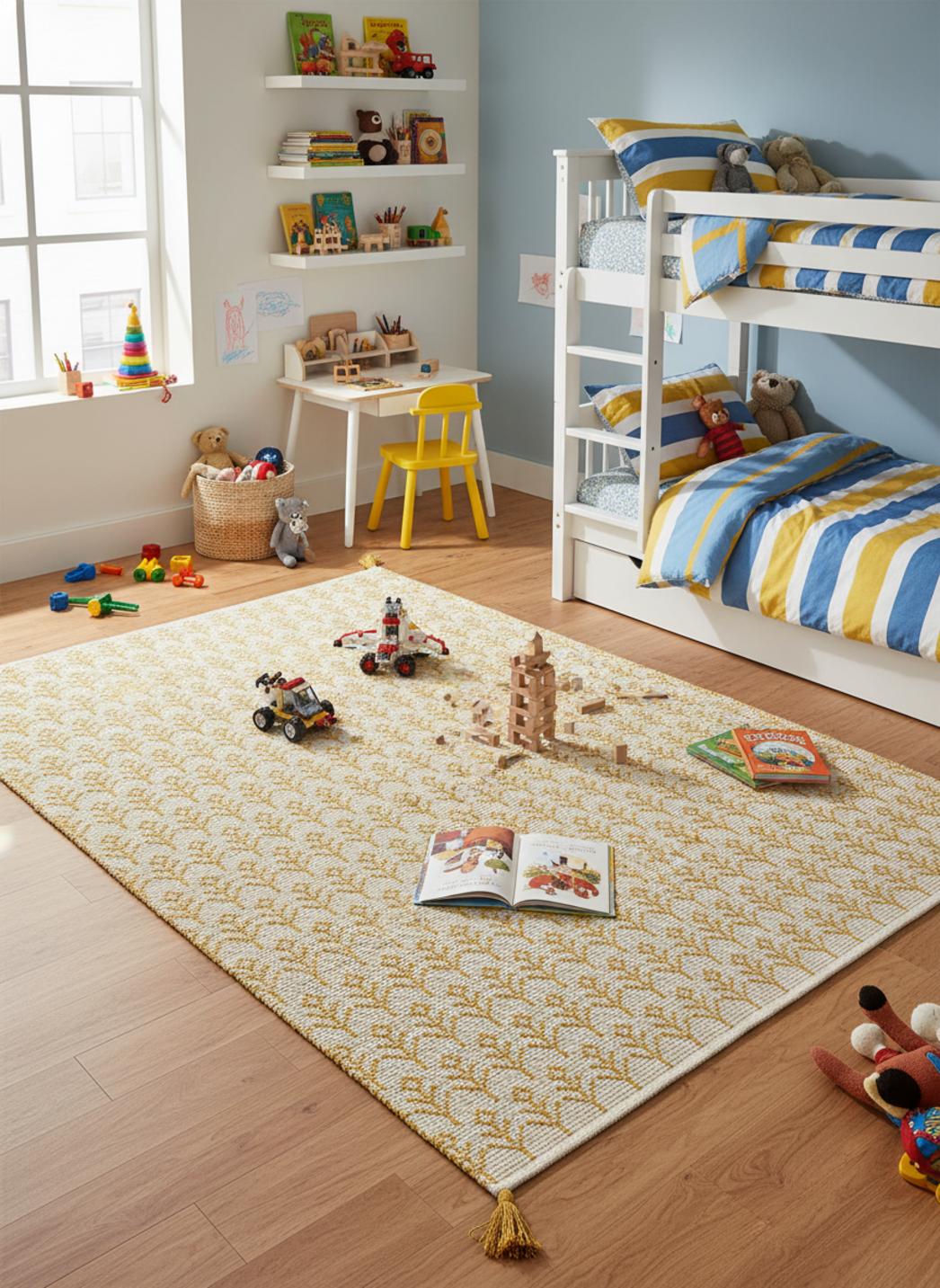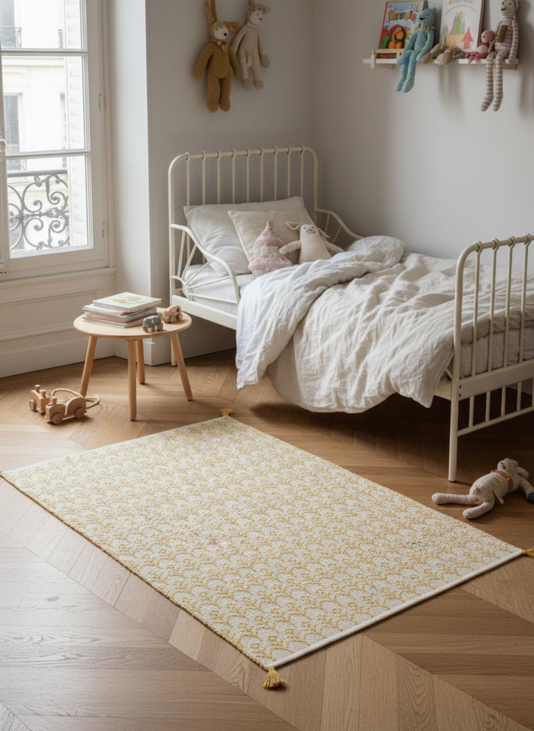 En ouvrant la porte, vous imaginez déjà un coin doux où les histoires s'installent et les petits instants deviennent grands : un tapis qui invite aux confidences, posé au pied du lit, parfait pour les lectures du soir et les siestes improvisées sous la veilleuse.