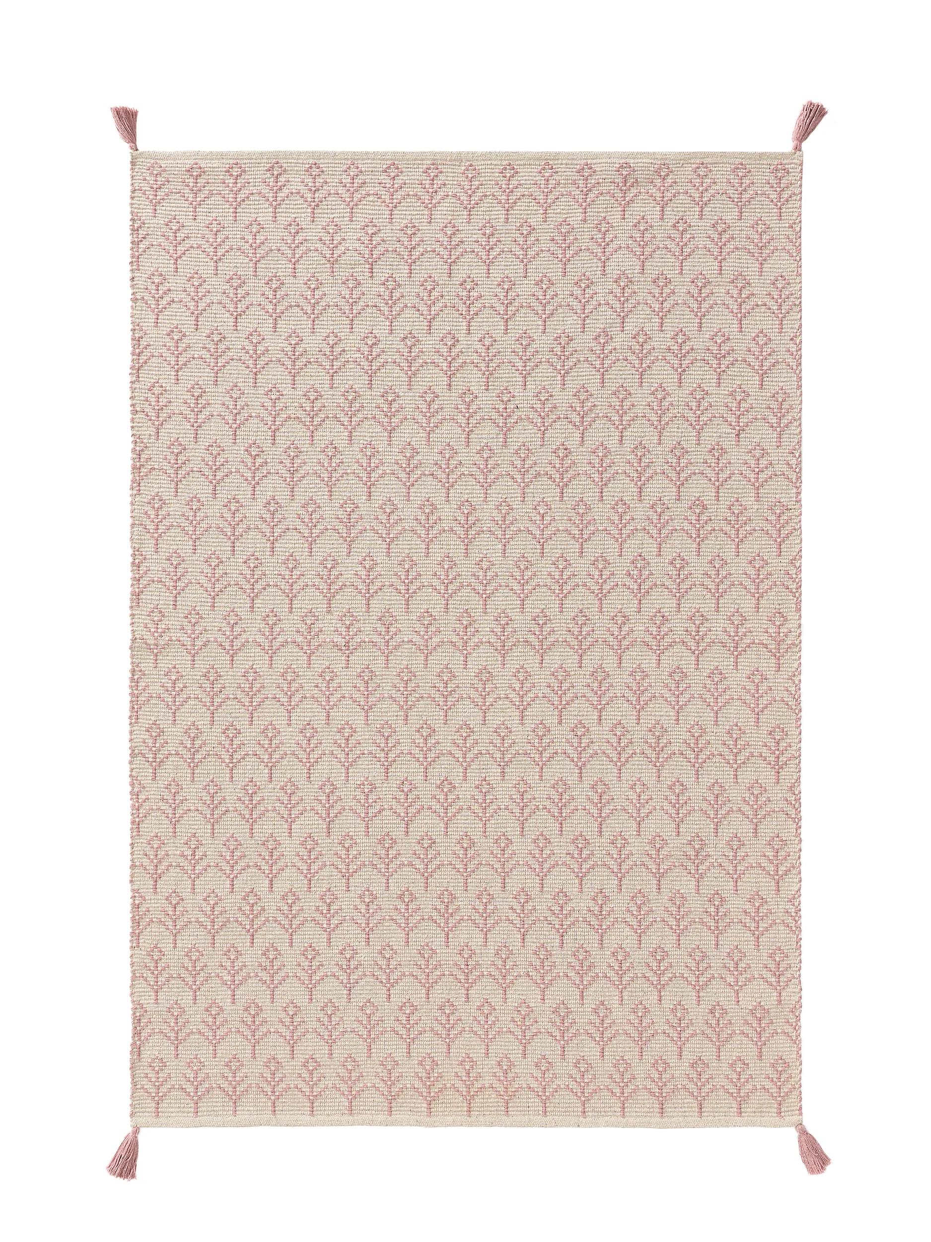 Quand la chambre s’illumine des derniers rayons du soir, imaginez votre petit qui s’allonge pour écouter une histoire, la tête posée sur un coussin, les doigts effleurant un tissage délicat : un kilim aux motifs tendres qui invite au toucher et à la rêverie. Les petites guirlandes de motifs floraux deviennent des chemins pour les doigts curieux, et les teintes beige et rose appellent une atmosphère douce où chaque soir devient rituel.
