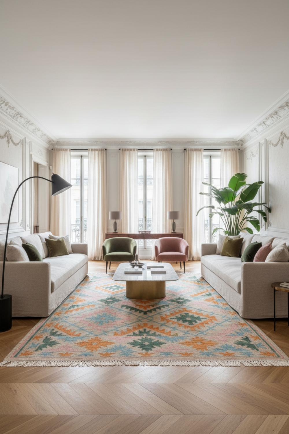 Évoquant la chaleur d’un intérieur habité, ce tapis sait se faire point focal ou toile de fond discrète. La palette multicolore amplifie la capacité décorative, capable de réveiller un salon, de chuchoter dans une chambre ou d’accueillir une entrée avec caractère. L’articulation des frises, des lignes irrégulières et des motifs géométriques crée un équilibre visuel durable, fidèle à l’idée d’un objet qui unit mémoire artisanale et design contemporain.