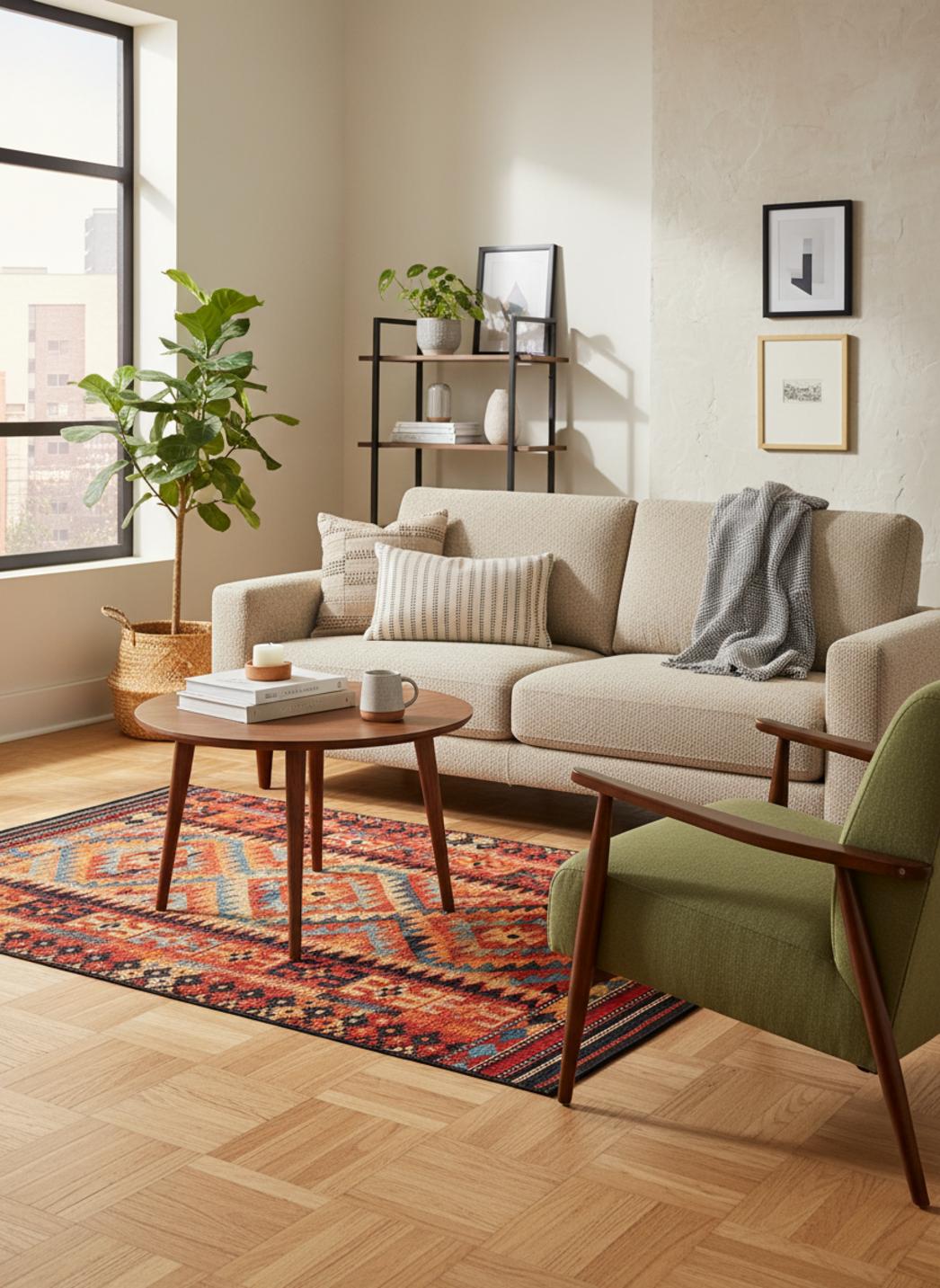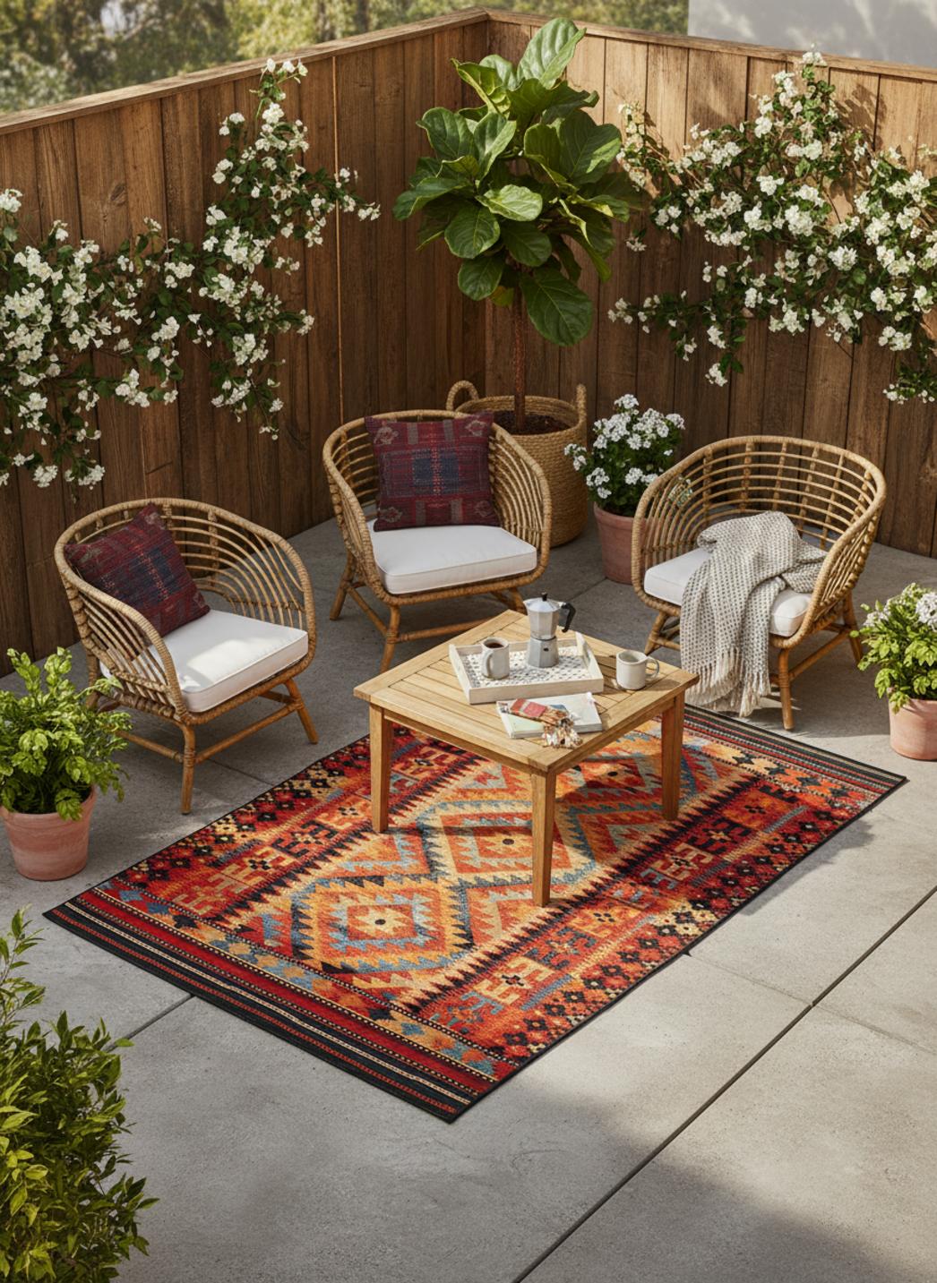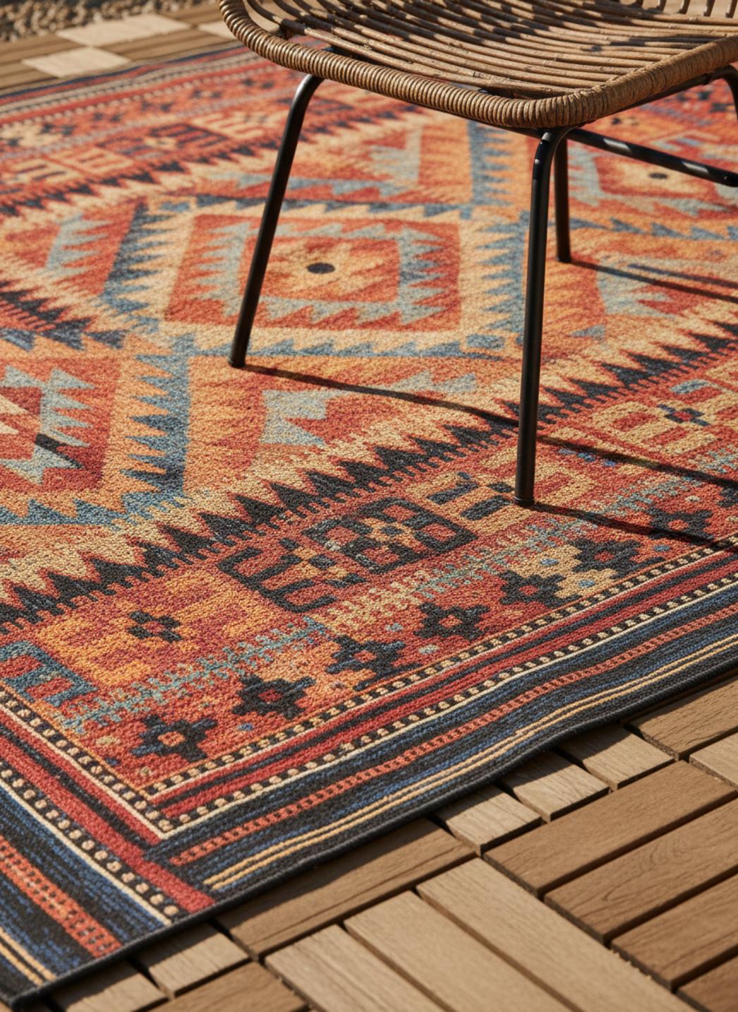 Chaleureux et plein de caractère, ce tapis au style kilim séduit par son tissage traditionnel et sa palette multicolore éclatante. Dans un petit format de 60x100 cm, il trouve parfaitement sa place sur un balcon, une entrée de terrasse ou un coin détente extérieur, apportant une note artisanale et vivante à la décoration. Ses motifs géométriques typiques du kilim évoquent l’authenticité et la richesse des cultures nomades, tout en insufflant une énergie joyeuse et chaleureuse à l’espace. Les couleurs, à la fois vives et équilibrées, s’accordent harmonieusement aux matériaux naturels comme le bois, la pierre ou le rotin. Ce tapis devient un accent décoratif idéal pour dynamiser un espace sans le surcharger, tout en créant un lien entre tradition et modernité. Placé devant une porte, sous une petite table ou au pied d’un fauteuil d’extérieur, il attire le regard et apporte du relief à la scène. Véritable concentré d’artisanat et de style, il transforme les petits espaces extérieurs en coins accueillants, colorés et pleins d’âme.