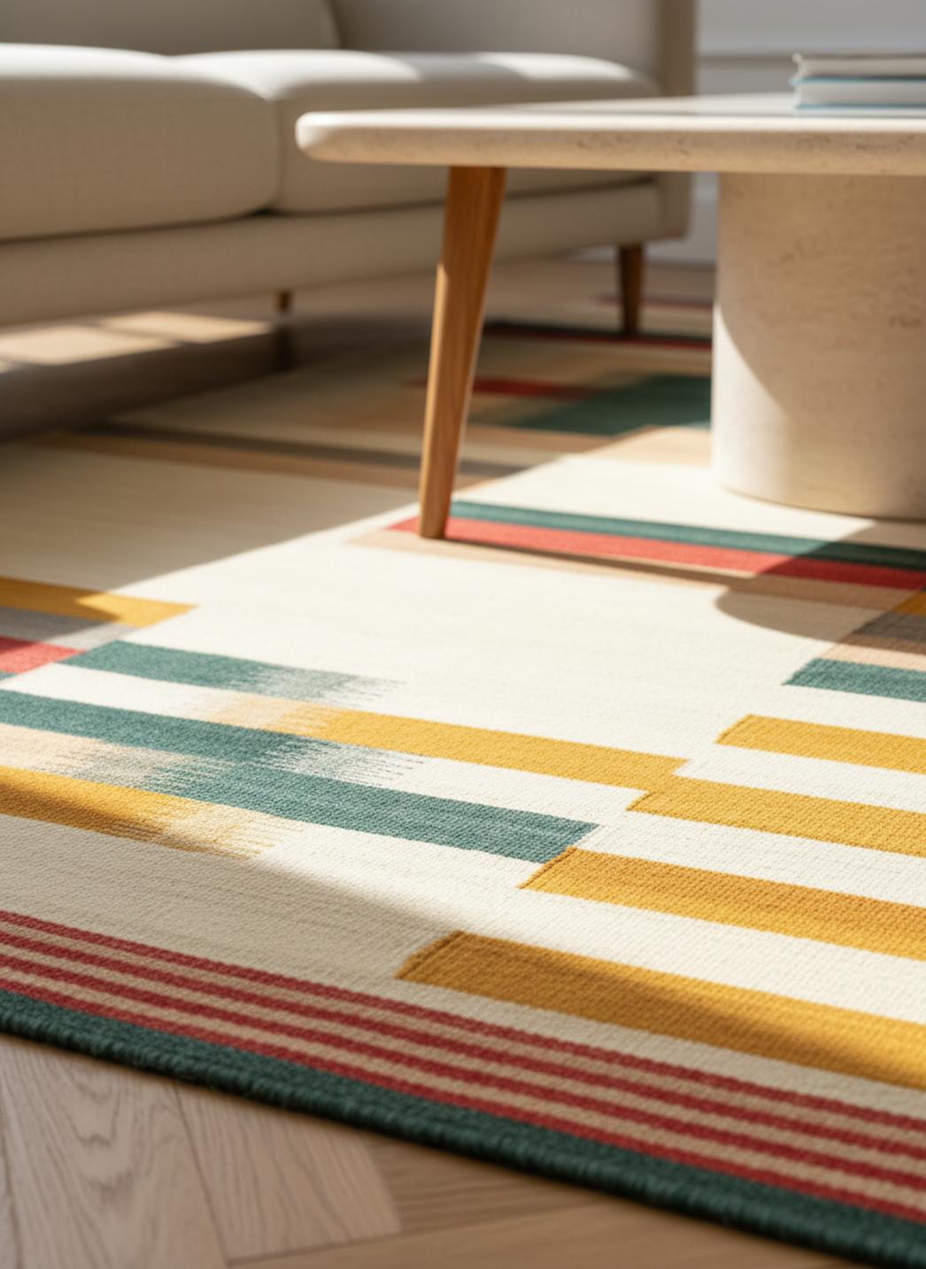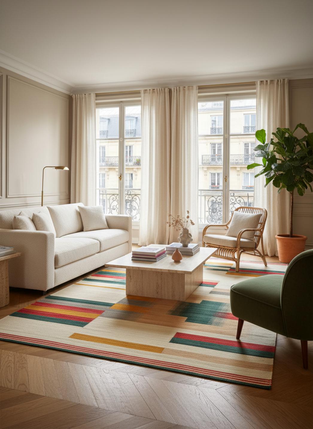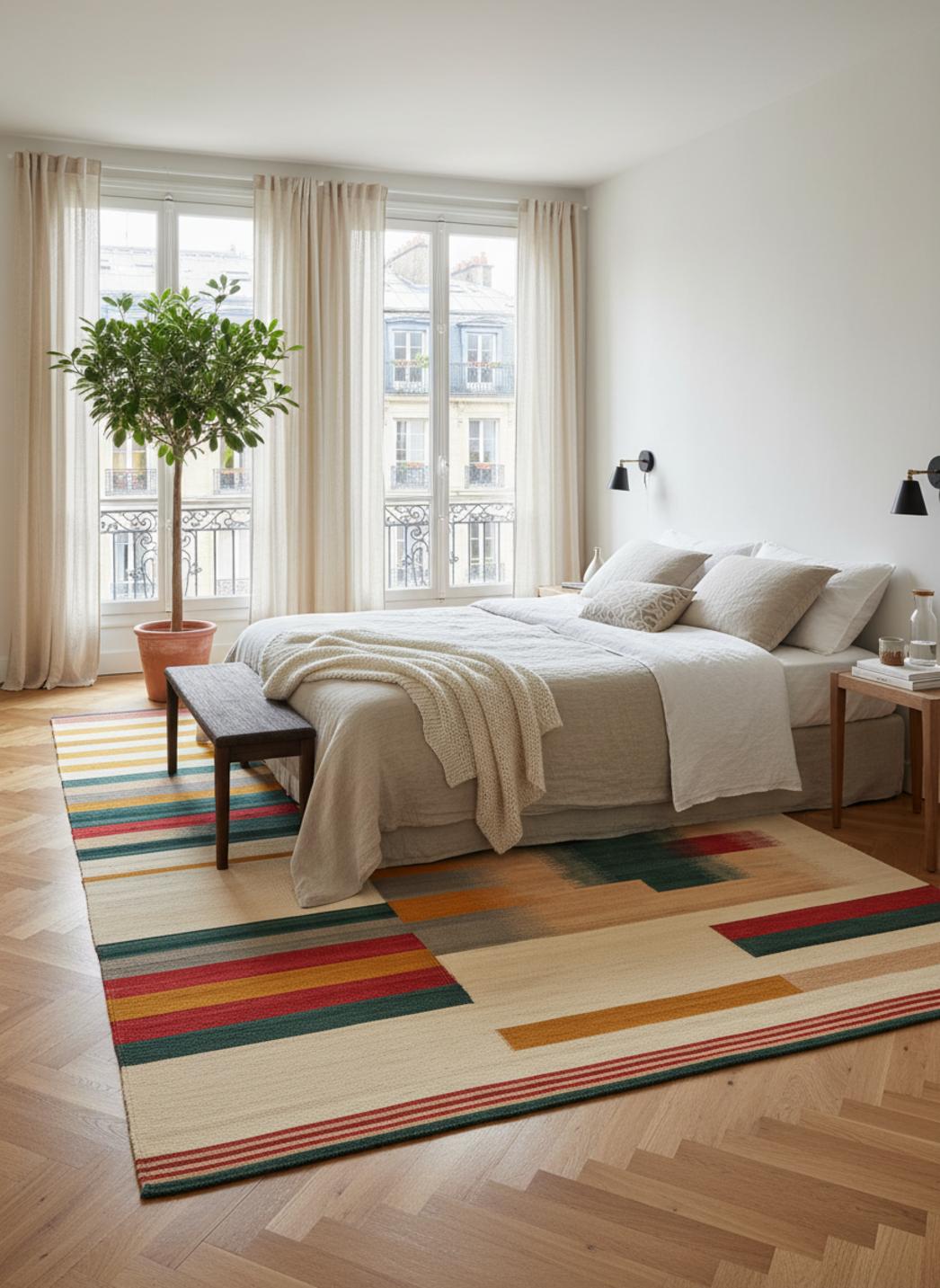 Dans une mise en scène contemporaine, l’inspiration méditerranéenne/bohème s’affirme par l’alchimie des motifs et des couleurs. Les frises ordonnent la composition tandis que les motifs répétitifs instaurent un rythme apaisant, propice à une entrée accueillante, à un salon structuré ou à une chambre où la chaleur visuelle invite au repos. L’ensemble conserve une lecture moderne, fidèle à une interprétation actuelle du kilim, sans prétendre au pastiche.