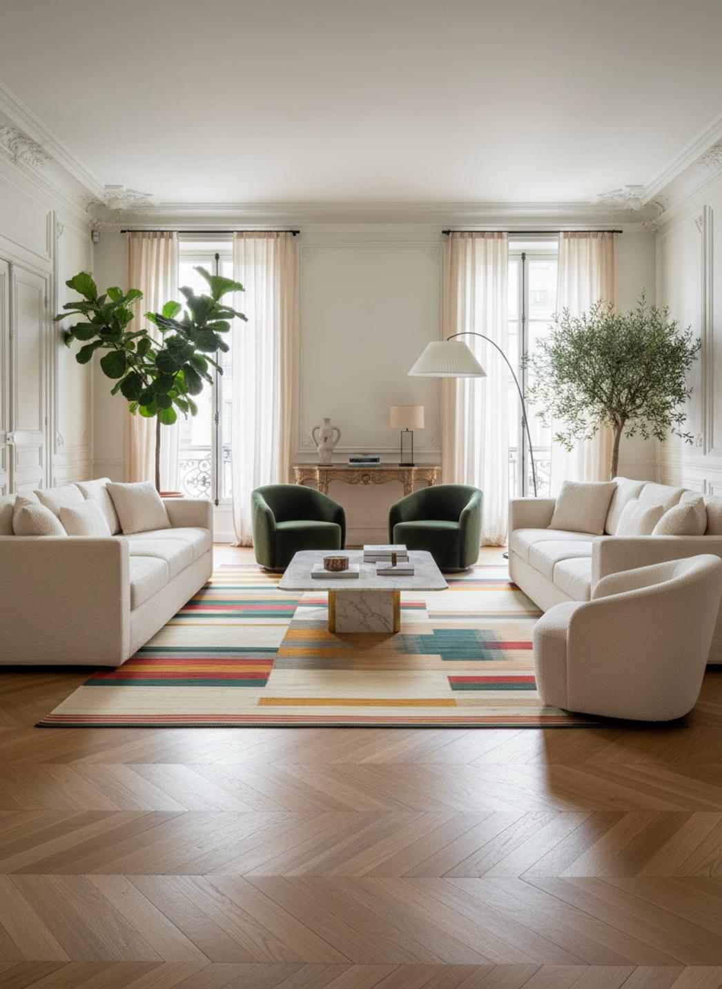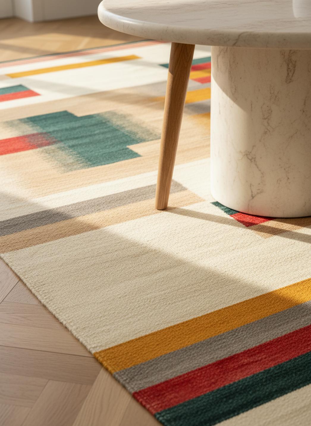 Le format 200x300 transforme l’objet en élément structurant : il définit un salon, encadre un canapé, guide le regard et harmonise les proportions d’un grand séjour. Sa dimension généreuse permet d’ancrer un espace, de créer une zone conversationnelle ou de réchauffer une chambre tout en respectant l’équilibre visuel propre au style contemporain tiré des codes kilim.